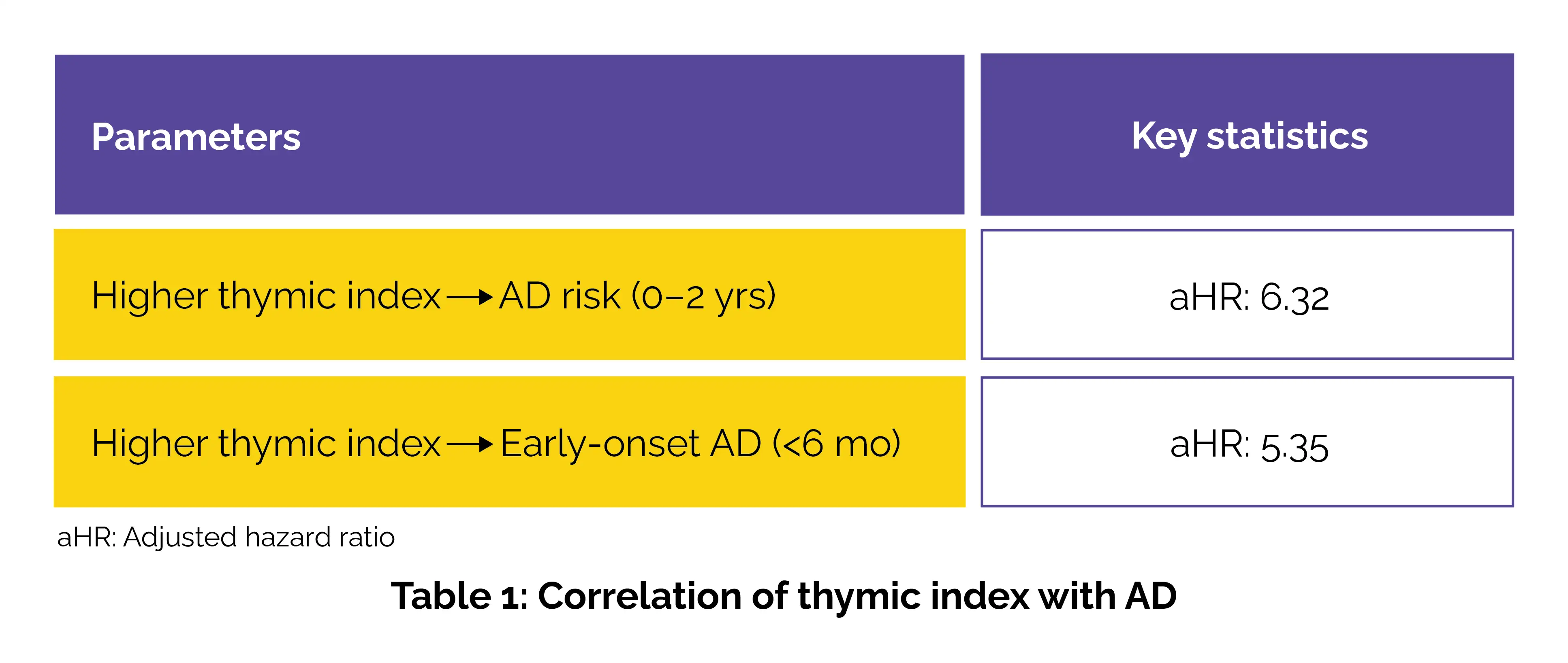 Among the 290 (97%) infants analyzed, over one-third (34%) developed AD within 2 years, with higher thymus size at 2 months strongly predicting both early-onset and overall AD risk (Table 1).