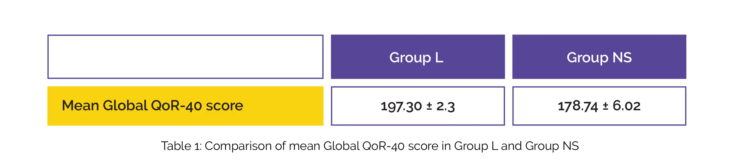 Similar demographic data was witnessed in both groups. The mean Global QoR-40  in group L vs. group NS is depicted in Table 1: