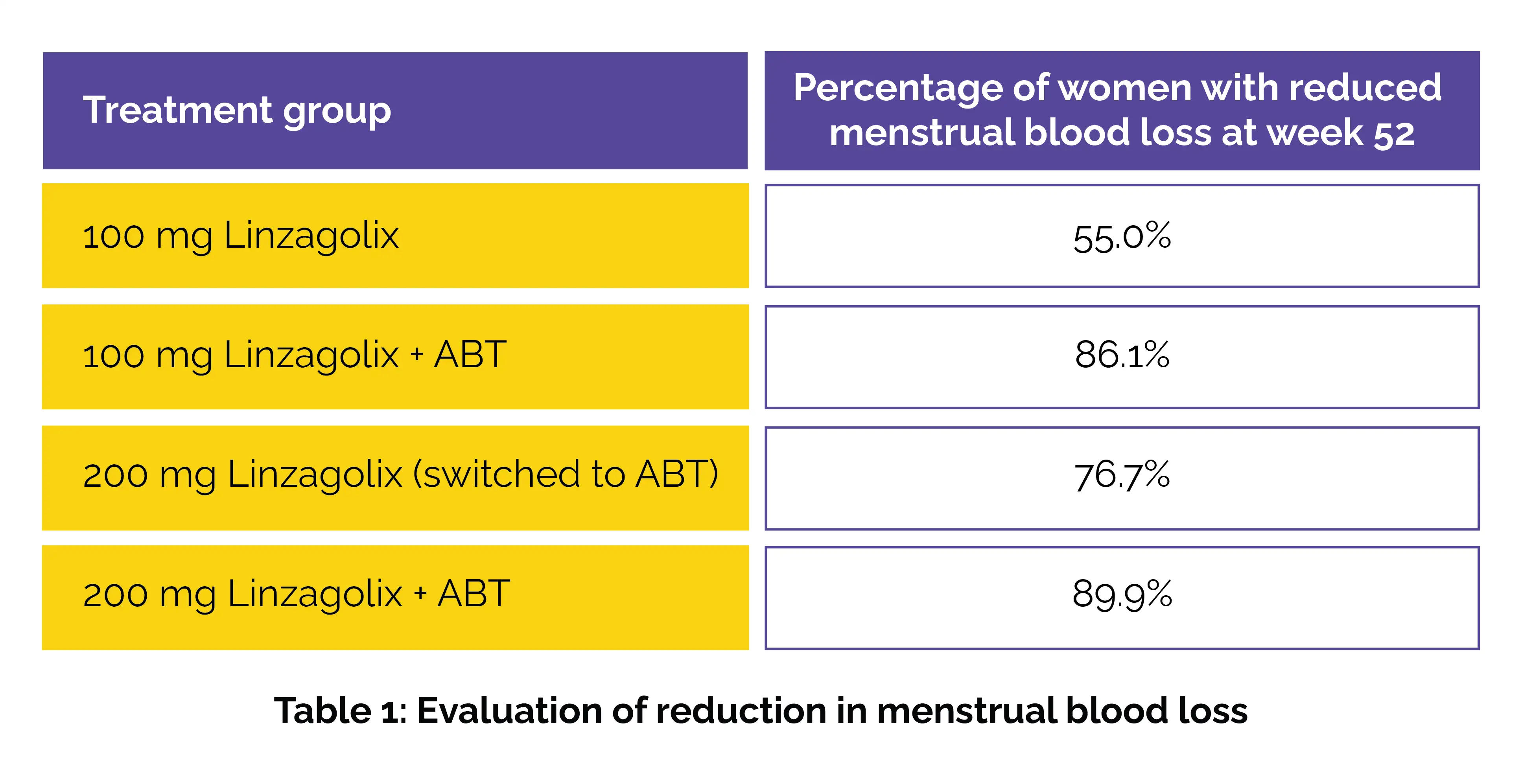 At the 52-week mark, linzagolix continued to show prominent reductions in menstrual blood loss when compared to baseline across all active treatment groups. Specifically, 55.0% of patients in the 100 mg group, 86.1% in the 100 mg + ABT group, 76.7% in the 200 mg group (switched to ABT), and 89.9% in the 200 mg + ABT group attained the primary endpoint—less than 80 ml of blood loss and more than 50% reduction from baseline.