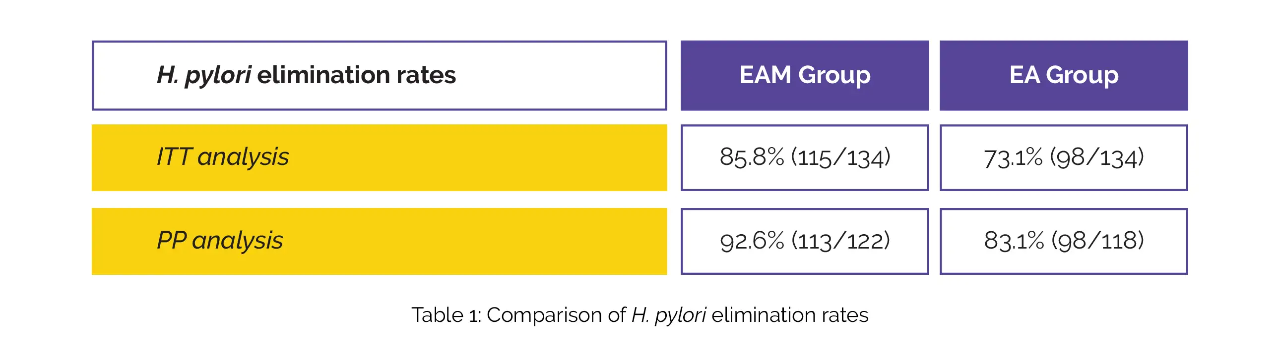 In contrast to the EA group, the EAM group's elimination rates were considerably greater in ITT analysis and PP analysis (Table 1).