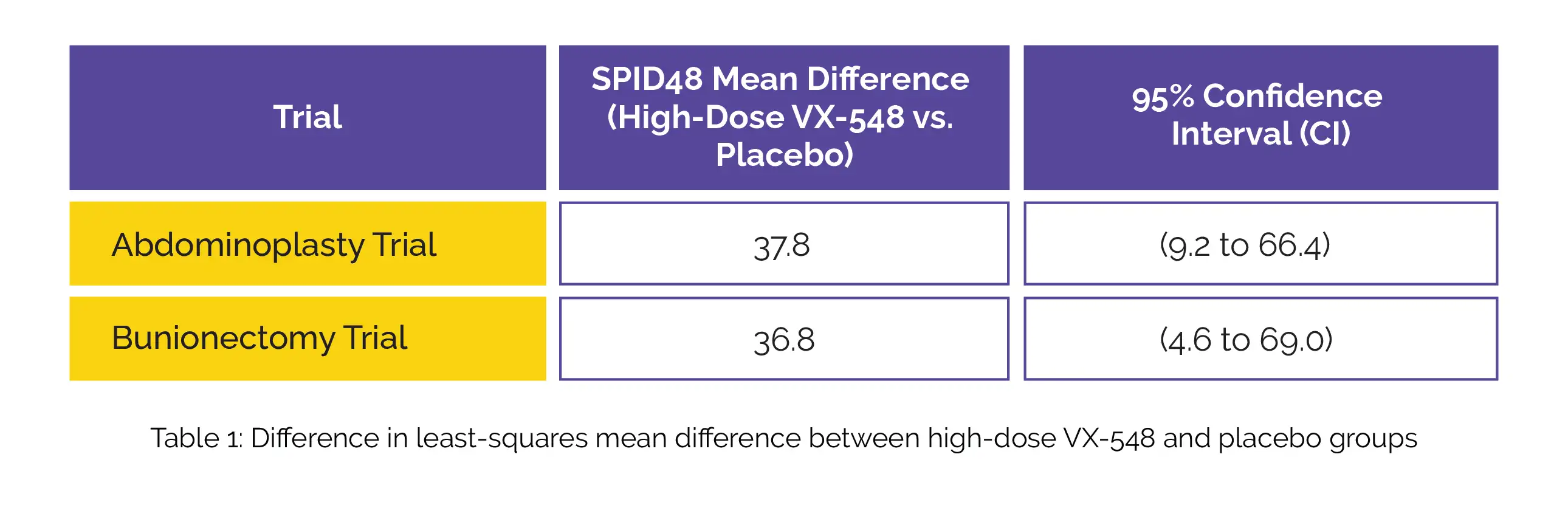 The primary endpoint focused on the time-weighted sum of the pain-intensity difference (SPID) measured over a 48-hour period (SPID48), which was calculated as per the scores from the Numeric Pain Rating Scale. Pain intensity was evaluated at 19 time points following the initial dose of VX-548 or placebo. The substantial reduction in the time-weighted SPID48 achieved with high-dose VX-548 compared to the placebo group after abdominoplasty and bunionectomy surgeries are displayed in the following Table 1: