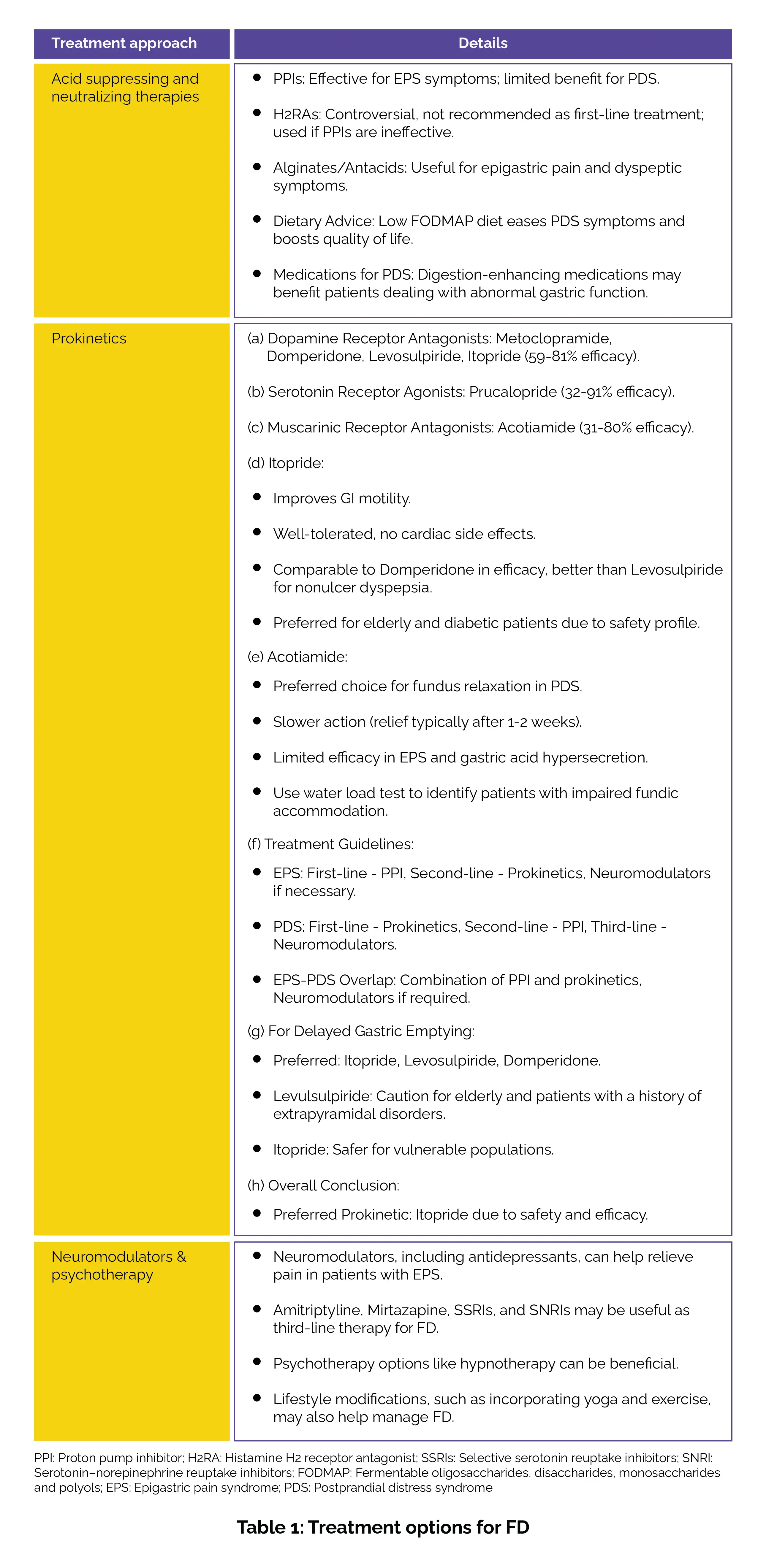 Managing FD involves a combination of acid-suppressing therapies, prokinetics, and neuromodulators tailored to the specific subtype. Proton pump inhibitors (PPIs) are effective for the epigastric pain syndrome (EPS) subtype, while prokinetics like itopride are preferred for postprandial distress syndrome (PDS). Neuromodulators and psychotherapy, such as selective serotonin reuptake inhibitors (SSRIs) and hypnotherapy, may be considered for refractory cases, where first-line treatments are ineffective. Treatment should be reassessed after 4-6 weeks to adjust therapy based on patient response. Table 1 summarizes various treatment modalities for FD.