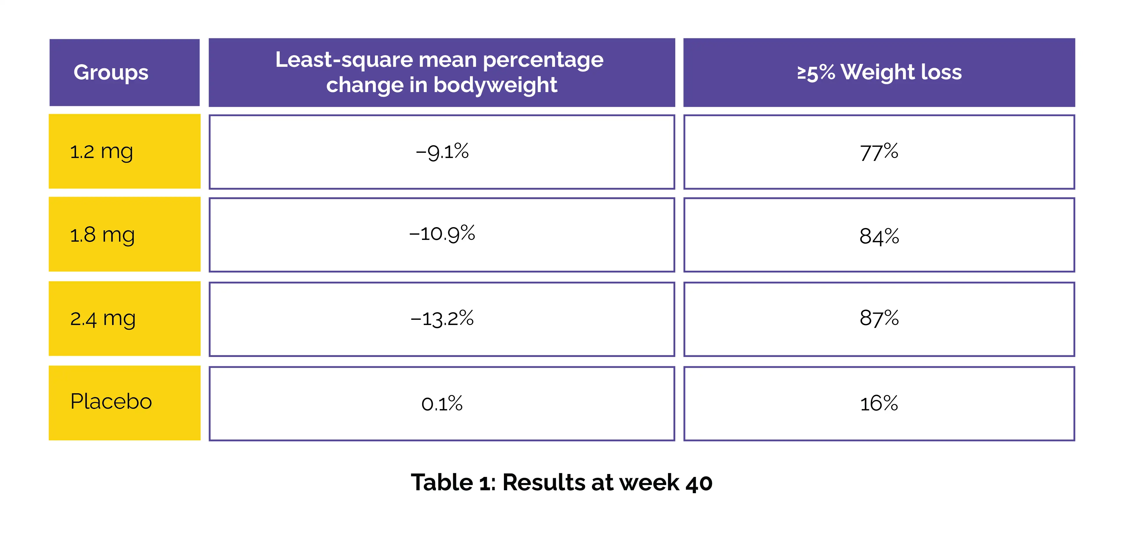 Participants received once-weekly injections of ecnoglutide (1.2 mg, 1.8 mg, or 2.4 mg) or placebo for 40 weeks. Co-primary endpoints were percentage bodyweight change and achievement of ≥5% weight loss. The results revealed superior reductions in weight with ecnoglutide across all doses compared with placebo (Table 1).