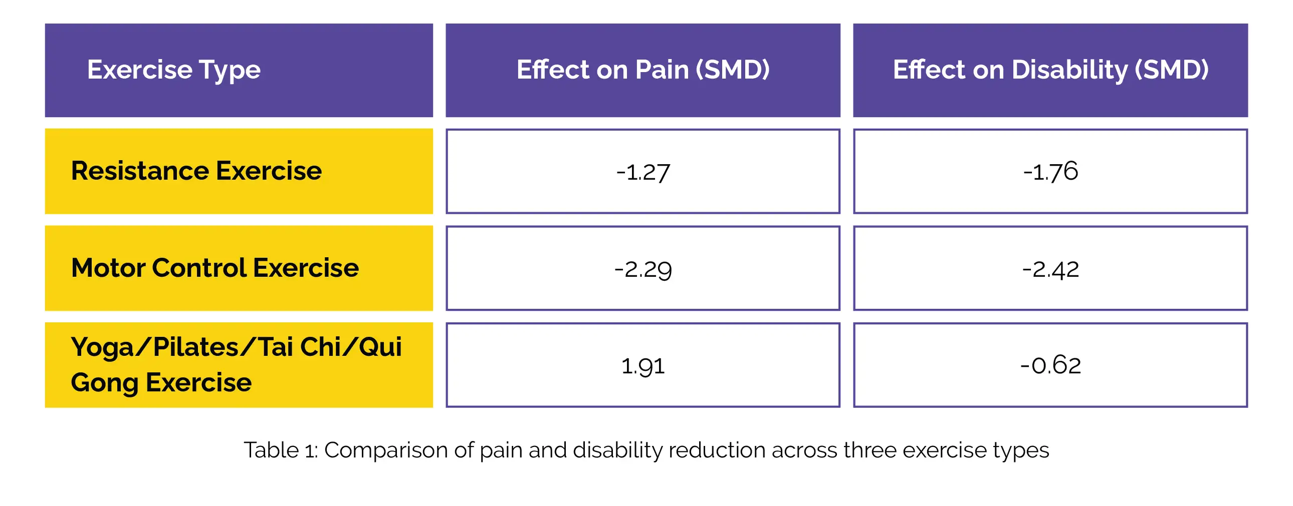 Furthermore, meta-regressions were carried out to determine the dose-response relationship for the effectiveness of each exercise type, using effect sizes of the interventions as the dependent variable and training dose and control group effects as independent variables.  A total of 68 trials were included in the assessment. Resistance exercise, motor control exercise, and Yoga/Pilates/Tai Chi/Qui Gong exercise were found to have significantly larger effects on pain and disability compared to the true control, as depicted in Table 1: