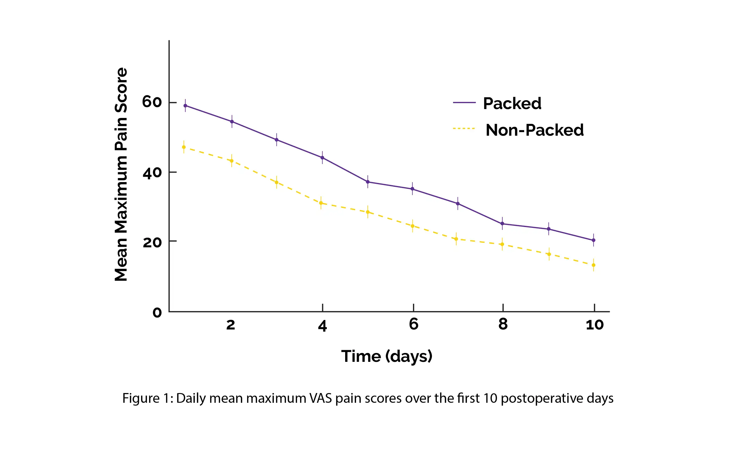 More pain was experienced by 213 individuals who were assigned to packing than by 220 participants who were assigned to non-packing (38.2 vs. 28.2, mean difference 9.9), as shown in Figure 1: