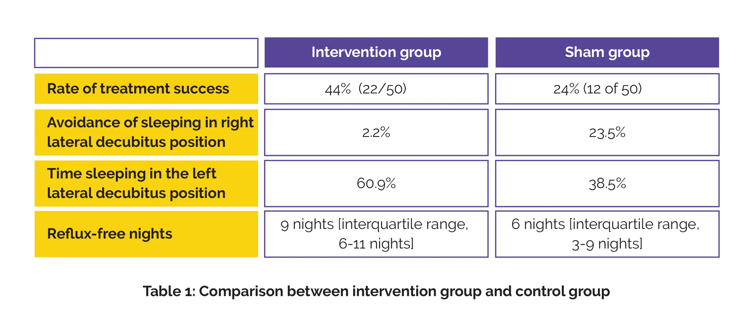 In intention-to-treat analysis, the rate of therapeutic success was higher in intervention group when compared to sham group (risk difference, 20%). Therapy resulted in substantial avoidance of sleeping in right lateral decubitus position and raised time sleeping in left lateral decubitus position. People in the intervention group exhibited considerably higher reflux-free nights when compared to the sham group.