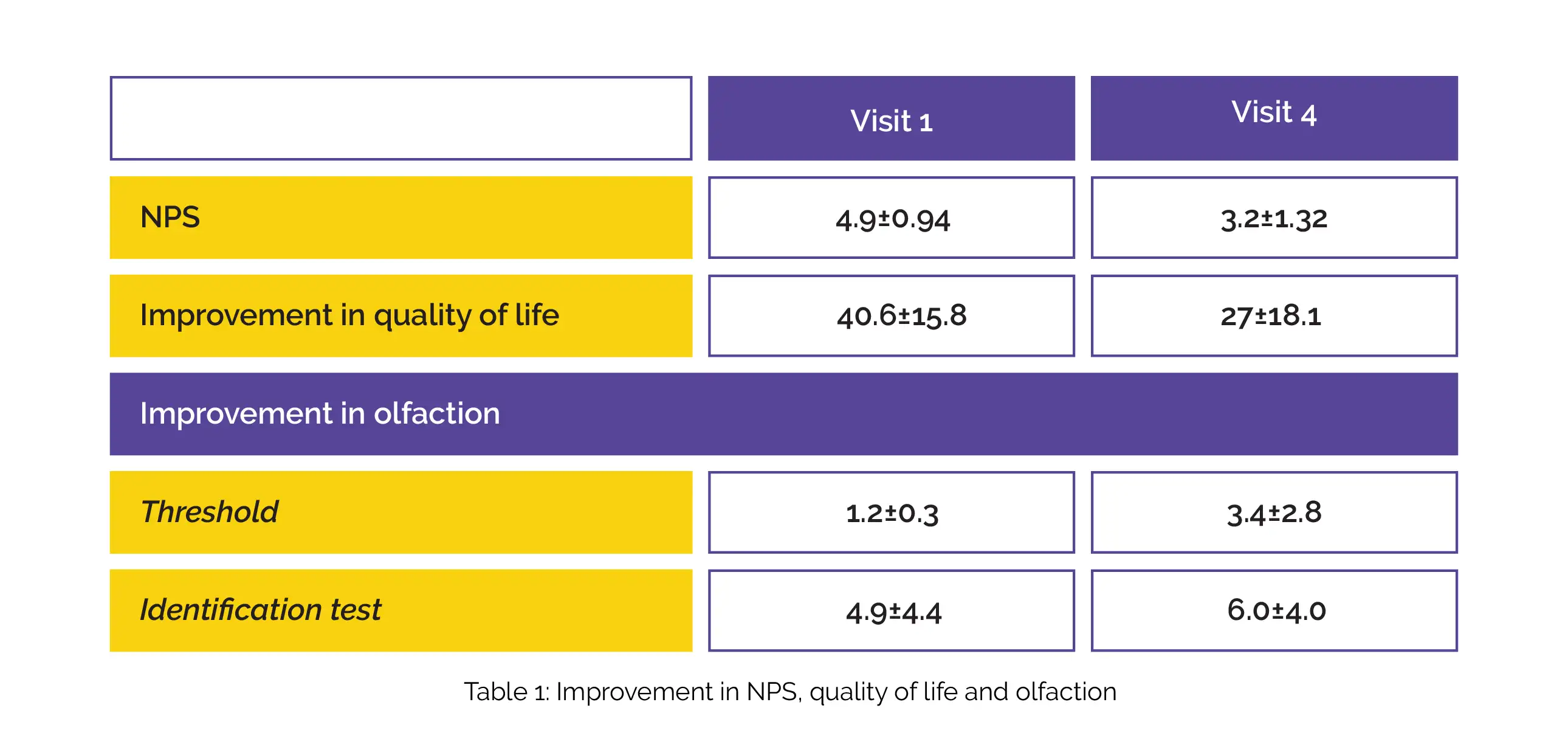 At visit 4, a profound decrease in NPS and an improvement in quality of life and olfaction were seen, as shown in Table 1: