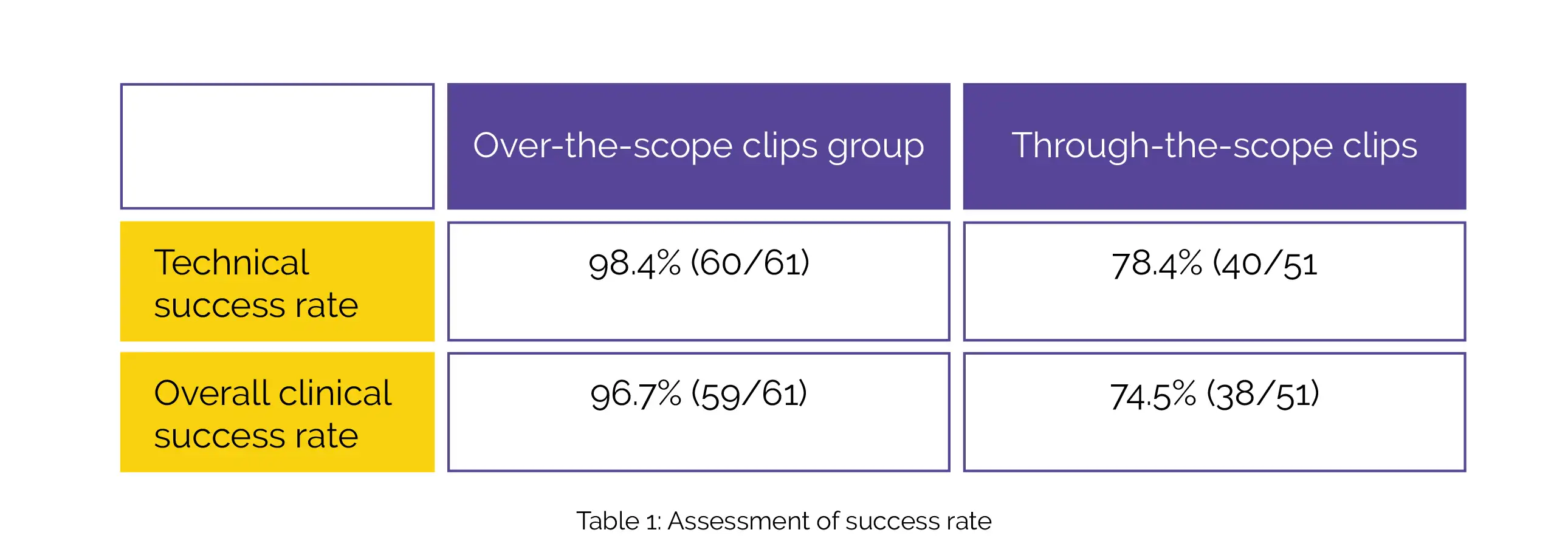 Out of 251 individuals screened, 112 patients were randomly assigned to receive therapy with the through-the-scope clips (n = 51) or the over-the-scope clip (n = 61). In the over-the-scope clips group, the technical success rate and overall clinical success rate were higher as opposed to the through-the-scope clips group.