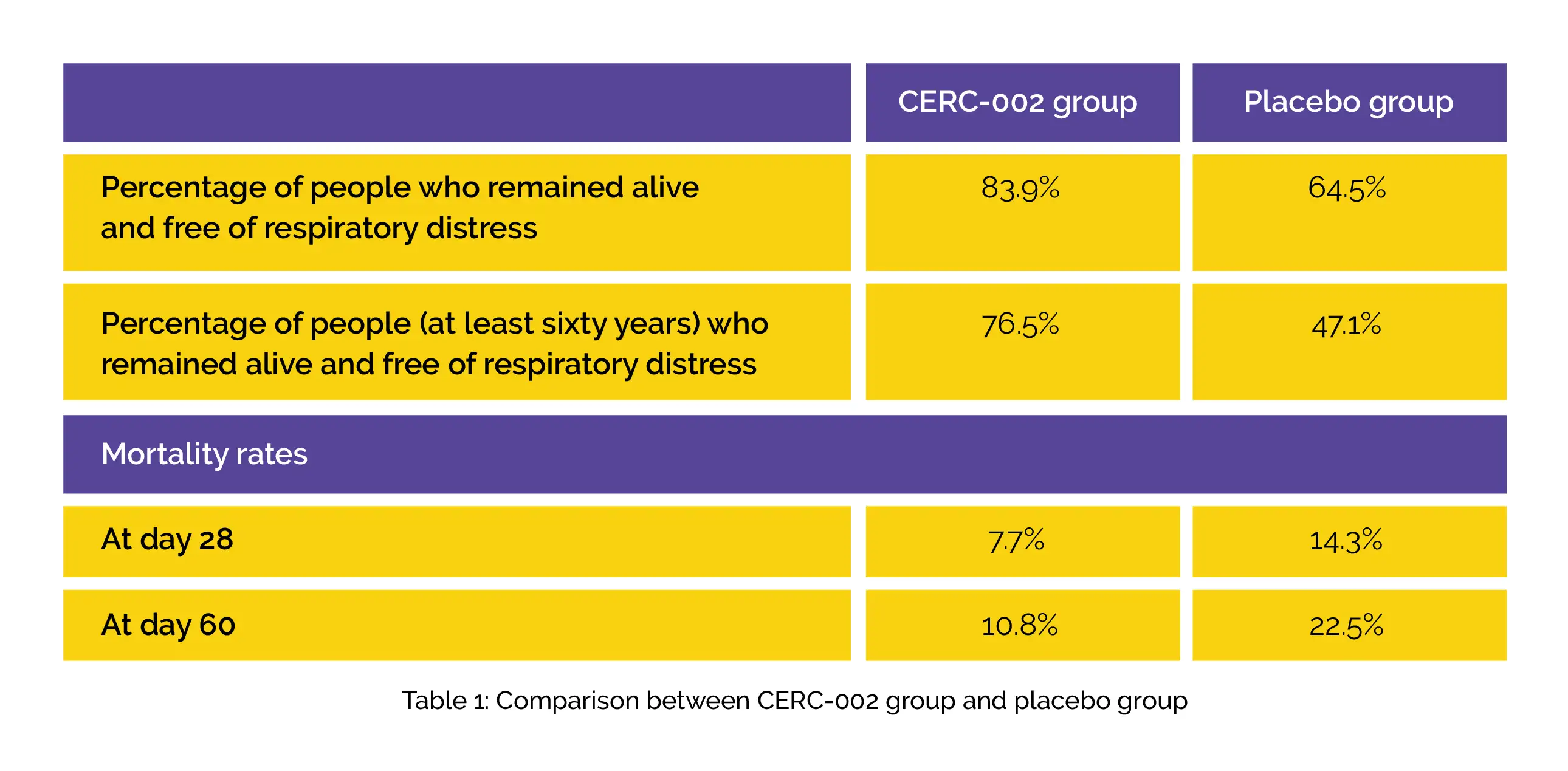 In a prespecified assessment as per the patient age, the benefit of CERC-002 over placebo was found to be maintained for people ≥ 60 years old. Furthermore, CERC-002 exhibited reduced mortality rates at day 28 and day 60 when compared to the placebo group, as shown in Table 1: