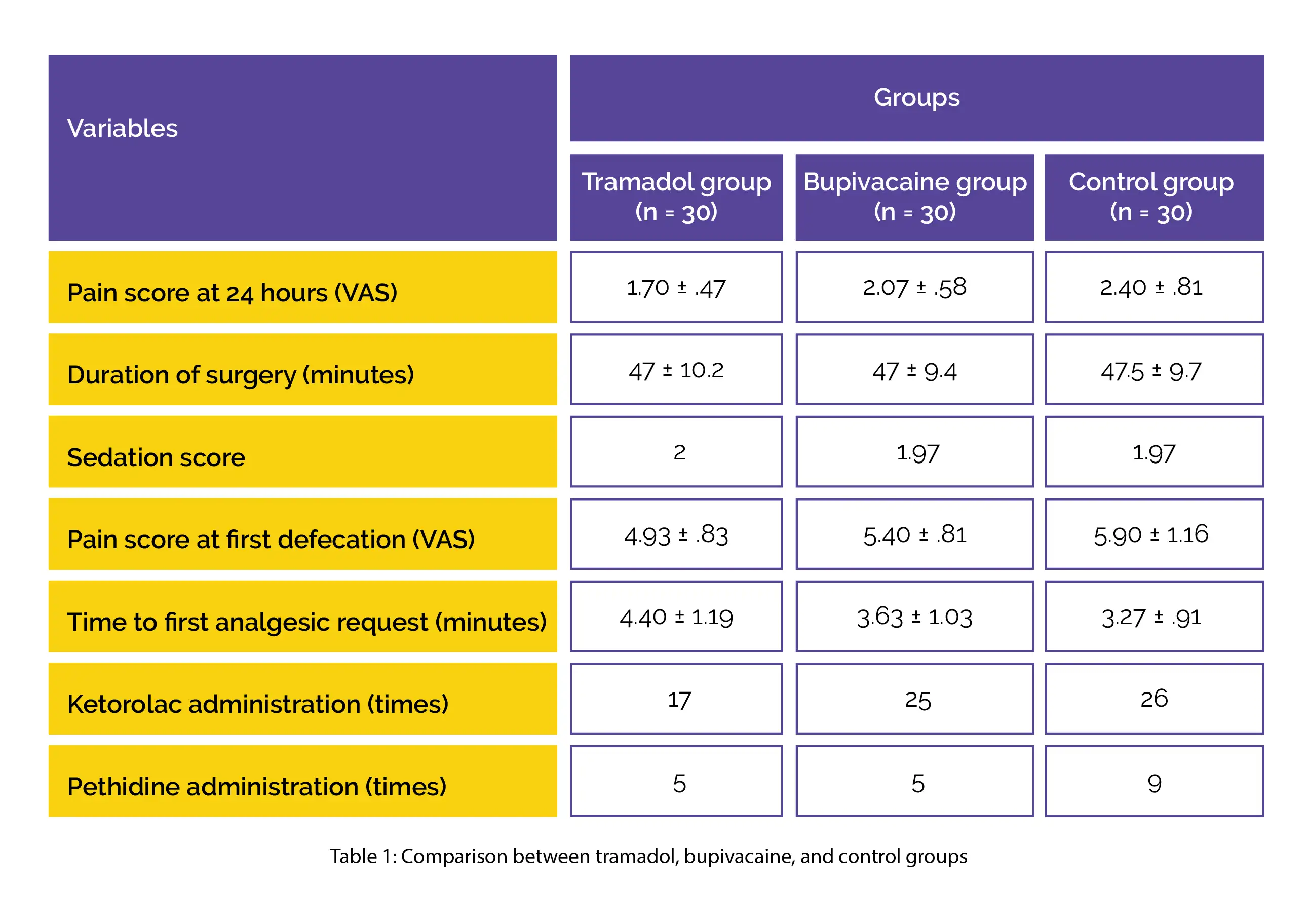 Maryam Hatami et al. undertook this study to investigate the impact of tramadol on postoperative pain in 90 people (age 18-75 years) with hemorrhoids and undergoing hemorrhoidectomy. Participants were randomized to receive perianal infiltration of either 0.25% bupivacaine (bupivacaine group), or tramadol (tramadol group) or normal saline (control group) prior to hemorrhoidectomy.