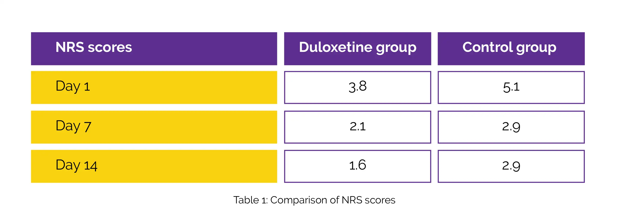In total, 35 subjects received 40 mg/day Duloxetine and 33 subjects did not receive Duloxetine (control). The frequency of use of analgesics as well as patient-reported outcomes, such as numeric rating scale (NRS) score at rest and KOOS, were examined between the groups. With the aid of NRS scores, the quality of recovery and knee pain were assessed. On postoperative day 1, day 7, and day 14, the NRS scores of Duloxetine group were substantially lower than the control group, as shown in Table 1: