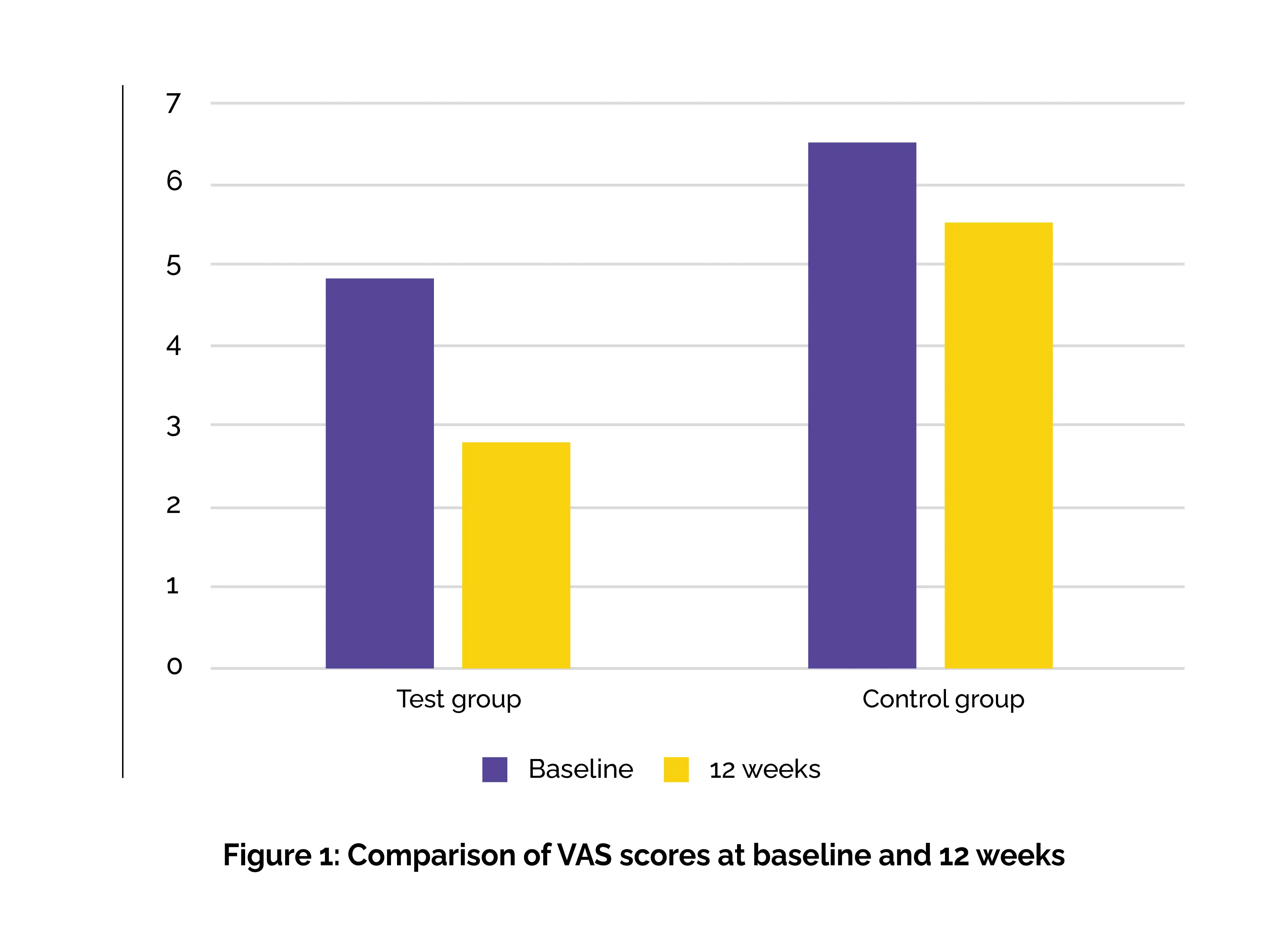 Maximum opening, lateral excursion (left and right), and visual analogue scale (VAS) scores were examined by a blinded investigator. Measurements were taken at four different time points: T0: baseline; T1: 2 weeks after T0; T2: 6 weeks after T0; T3: 12 weeks after T0. All the measured outcomes revealed consistent improvement in both groups, with the test group illustrating more pronounced changes. The reduction in VAS scores was markedly greater in the test group (Figure 1).