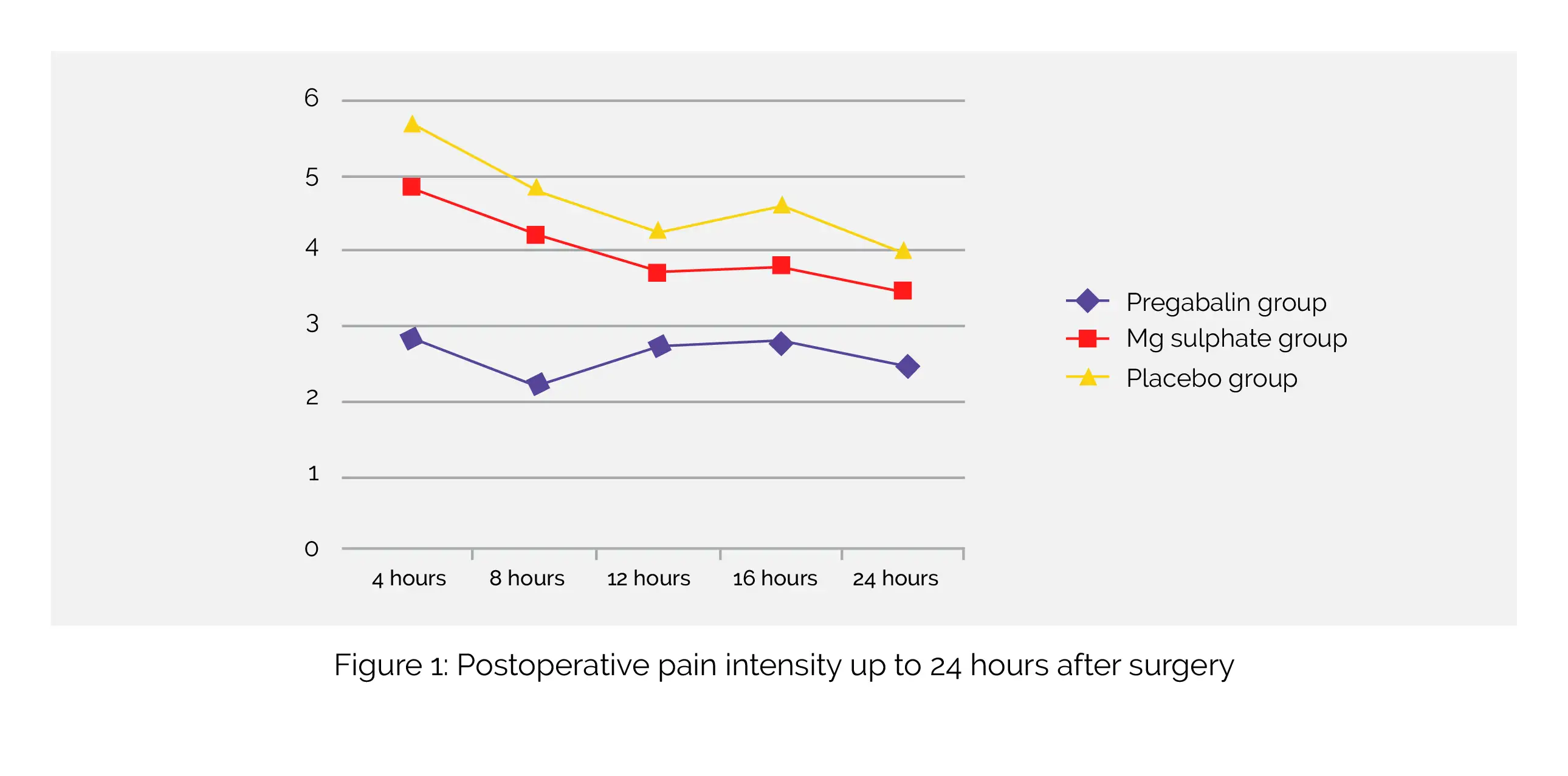 Assessment of postoperative nausea and vomiting (PONV), sedation score, and degree of pain was done. Compared to the Pregabalin group, the mean numerical rating scale (NRS) in postoperative period was greater in the Mg sulphate and placebo group up to 24 hours after surgery, as shown in Figure 1: