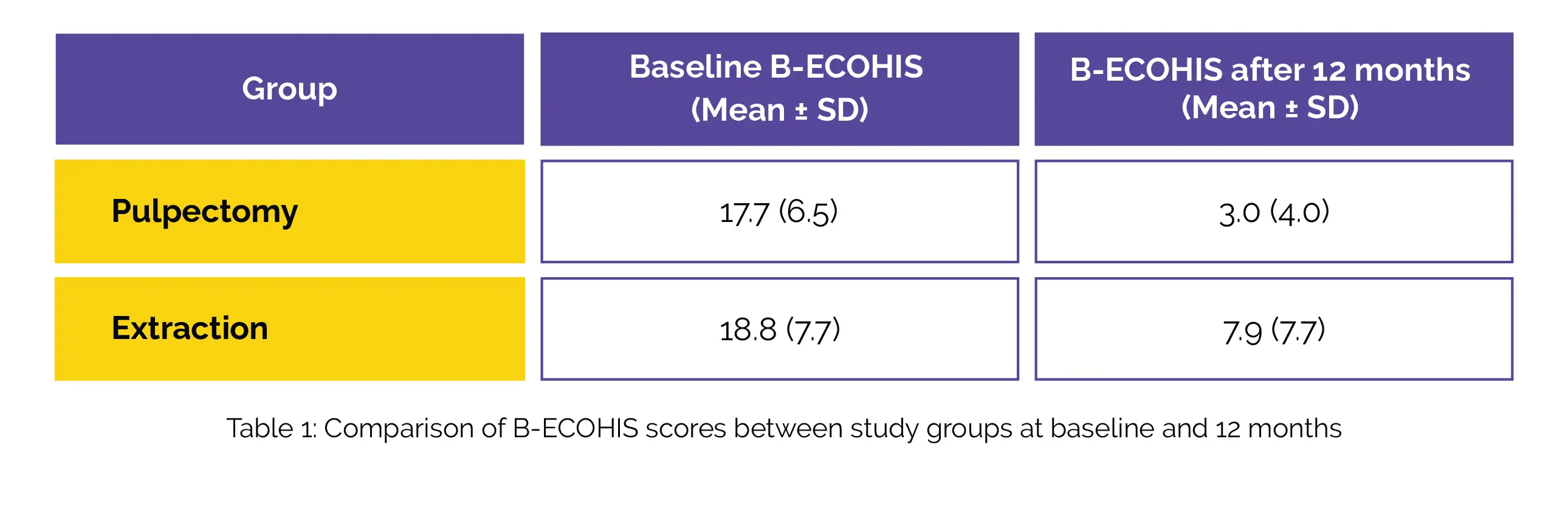 To analyze the differences between the groups in the study, the researchers employed bootstrap linear regression for B-ECOHIS scores, logistic regression for self-reported dental pain, and anxiety scores, with α = 5%. The mean (standard deviation [SD]) B-ECOHIS scores at the start and after 12 months for the pulpectomy group and the extraction group are depicted in Table 1.