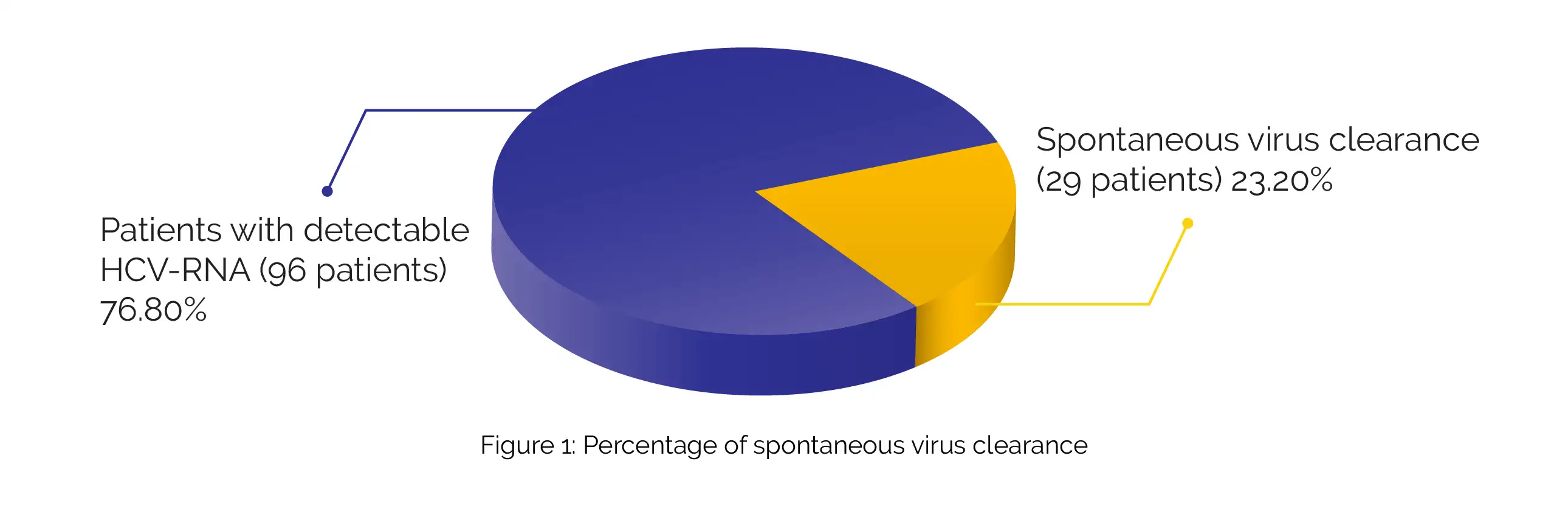 A periodic assessment of the values of total blood counts, liver function, and enzyme tests (creatinine phosphokinase and serum amylase) was done. The virological response was evaluated by HCV-RNA test after 12 weeks. About 23.2% (29 people) of total participants had spontaneous virus clearance with an undetectable HCV-RNA (Figure 1):