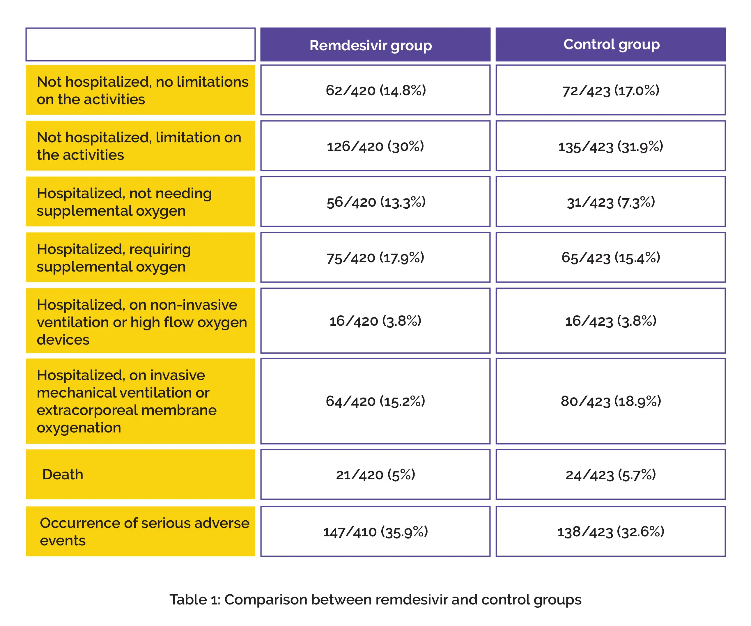 Clinical status at 15th  day estimated by World Health Organization (WHO) 7-point ordinal scale, determined in intention-to-treat population was major endpoint ascertained. Overall, 857 subjects were randomized to one of the two groups and 843 subjects were incorporated for the final assessment (remdesivir, n=420; control, n=423). Regarding the occurrence of serious adverse events, no considerable inter-group difference was noted.