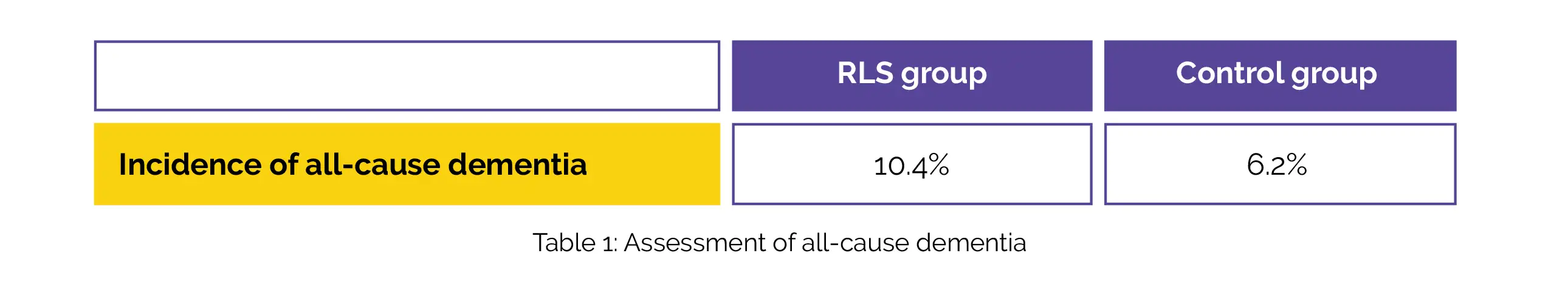 It was also investigated how dopamine agonists affected the likelihood of dementia in RLS-affected people. The participants were mostly female (63.4%), with a baseline mean age of 73.4. The RLS group had a greater incidence of all-cause dementia than the control group (10.4% vs. 6.2%), as illustrated in Table 1: