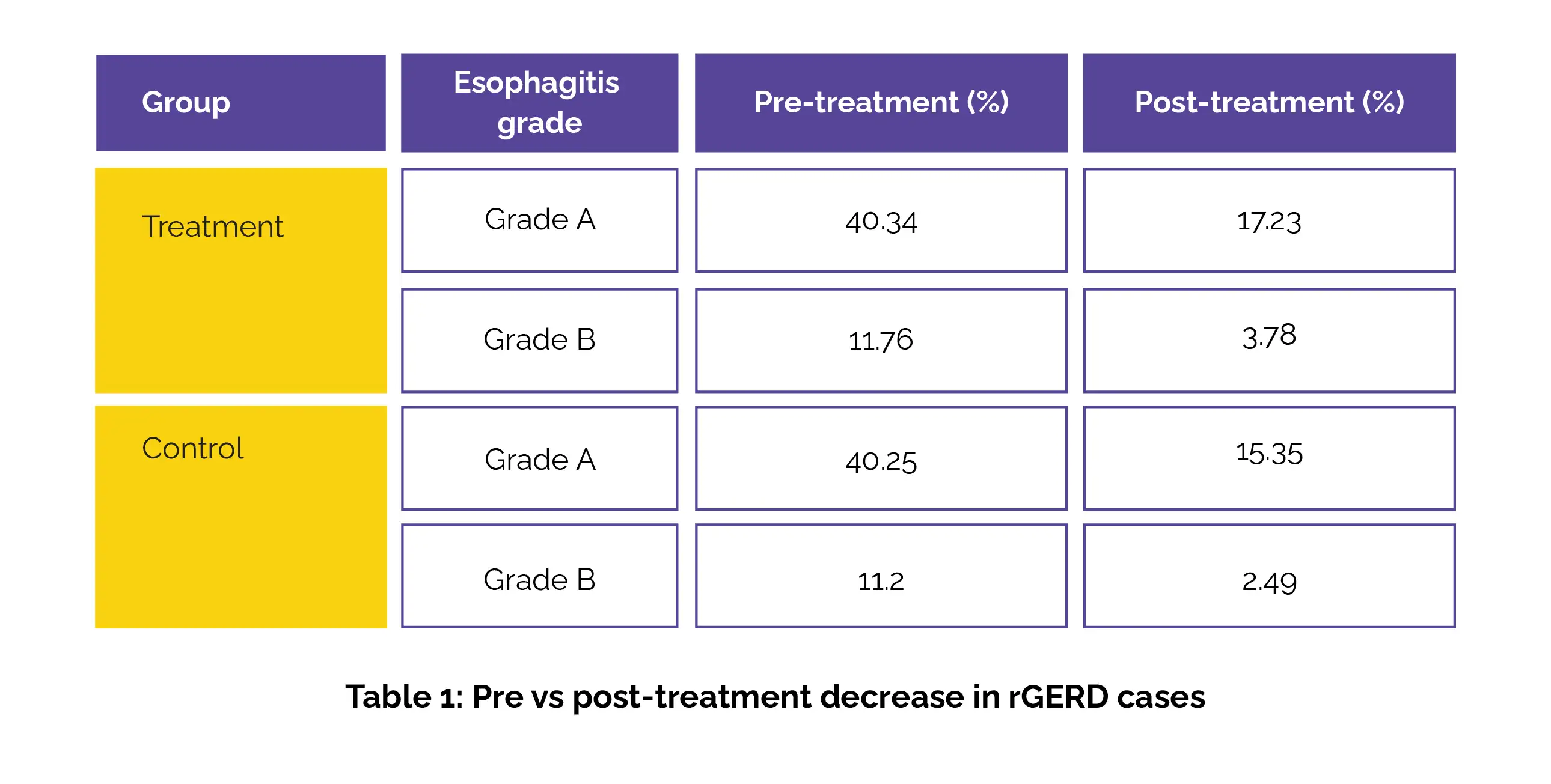 The treatment group illustrated greater overall clinical symptom efficacy and lower total symptom scores when compared to the control group. Additionally, the treatment group outperformed the control group in decreasing major rGERD symptom scores, including heartburn, retrosternal pain, regurgitation, belching, and acid regurgitation. Both the treatment (Z = 8.169) and control groups (Z = 9.800) markedly reduced the degree of esophageal inflammation, showing comparable efficiency (Table 1).