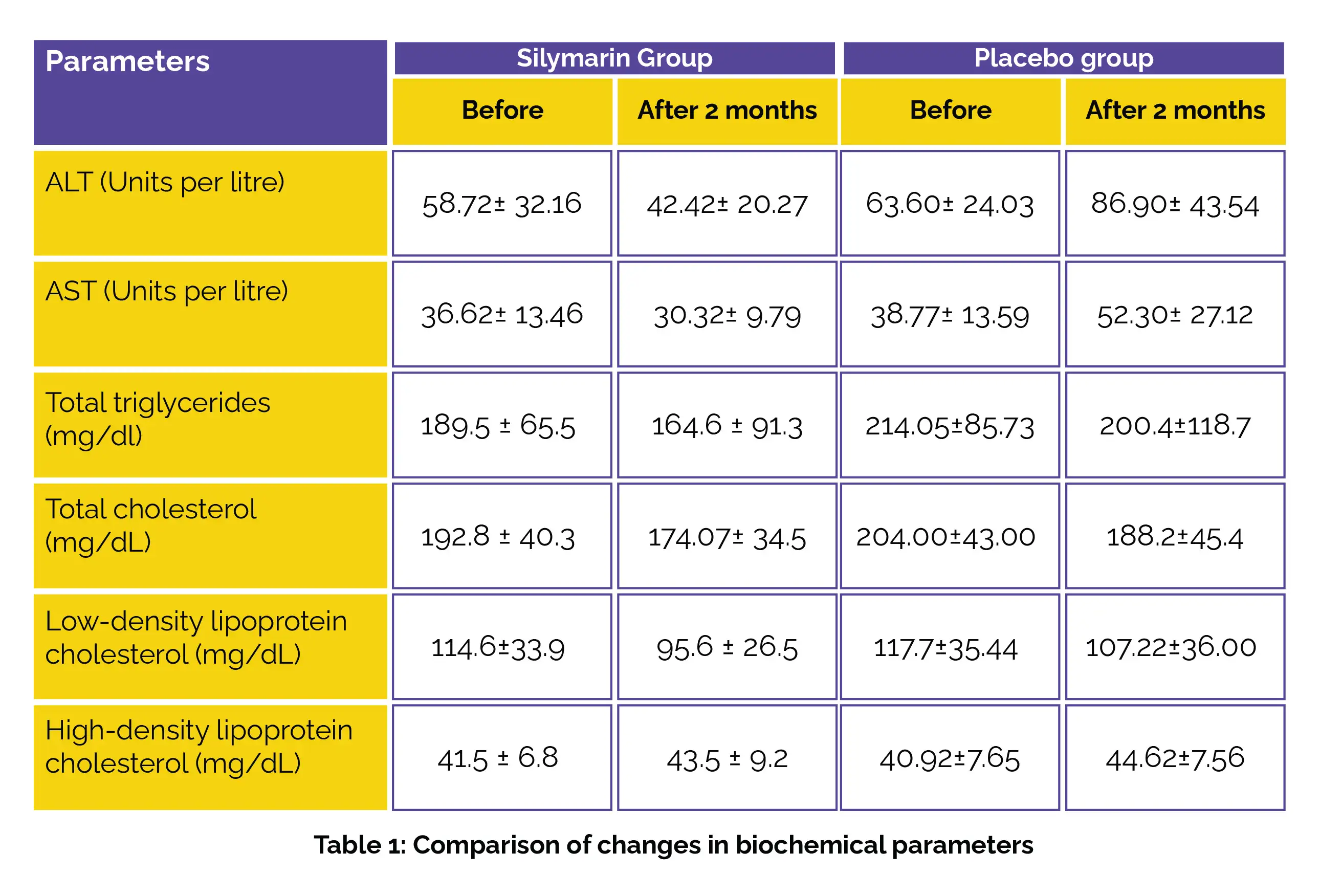 In total, 80 patients diagnosed with NAFLD participated in the study. Among them, 40 patients were given a daily supplement of 150 mg of Silymarin for two months, while the remaining 40 were administered a placebo. Both groups were instructed to undergo hypertriglyceridemia correction and adopt lifestyle modifications. Serum lipid profiles and liver enzyme evaluations were conducted for both groups at the beginning of the study and the following two months.