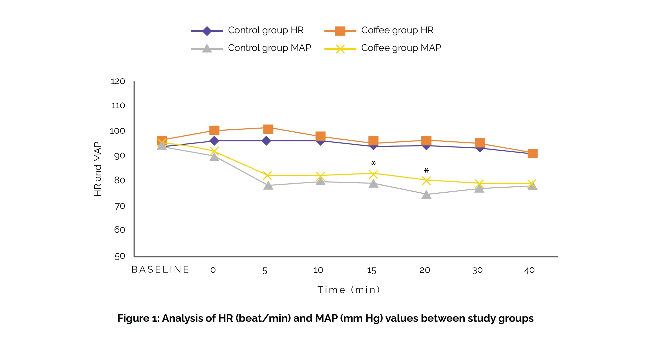 In the coffee group, the occurrence of intraoperative low blood pressure was 48.6%, while in the control group, it was 71.4% (p = 0.006). Heart rate (HR) values were similar across groups (p > 0.05), but mean arterial pressure (MAP) was considerably higher in the coffee group at 15 and 20 minutes (p = 0.037 and p = 0.008), as shown in Figure 1: