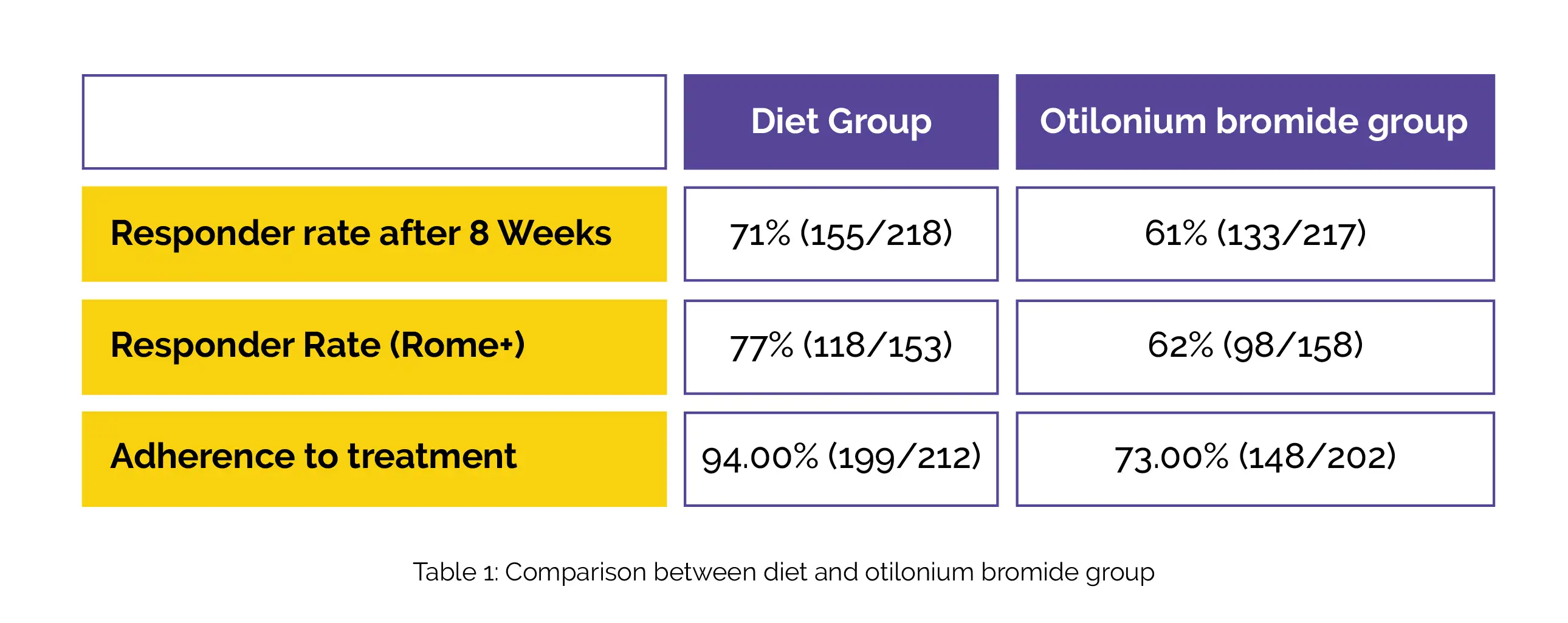 A total of 459 IBS-affected people (average age 41±15 years, 76% female, 70% Rome+) were randomized for the study. After 8 weeks, the responder rate was considerably greater in the diet group when compared to the otilonium bromide group, with the difference more pronounced in the Rome+ subgroup. Adherence to the assigned treatment was higher for the diet group when compared to the otilonium bromide group, as illustrated in Table 1: