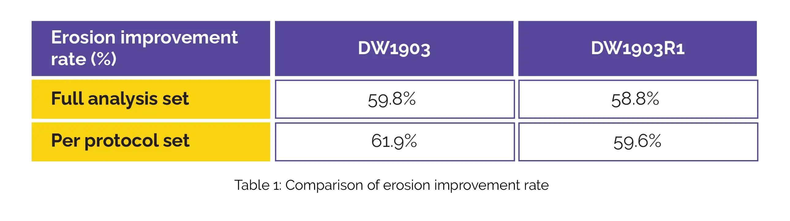In the context of the full-analysis set, the DW1903 group demonstrated an erosion improvement rate of 59.8%, while the DW1903R1 group exhibited a rate of 58.8%. When considering the per-protocol analysis, the DW1903 group showcased a rate of 61.9% for erosion improvement, while the DW1903R1 group had a rate of 59.6%, as shown in Table 1: