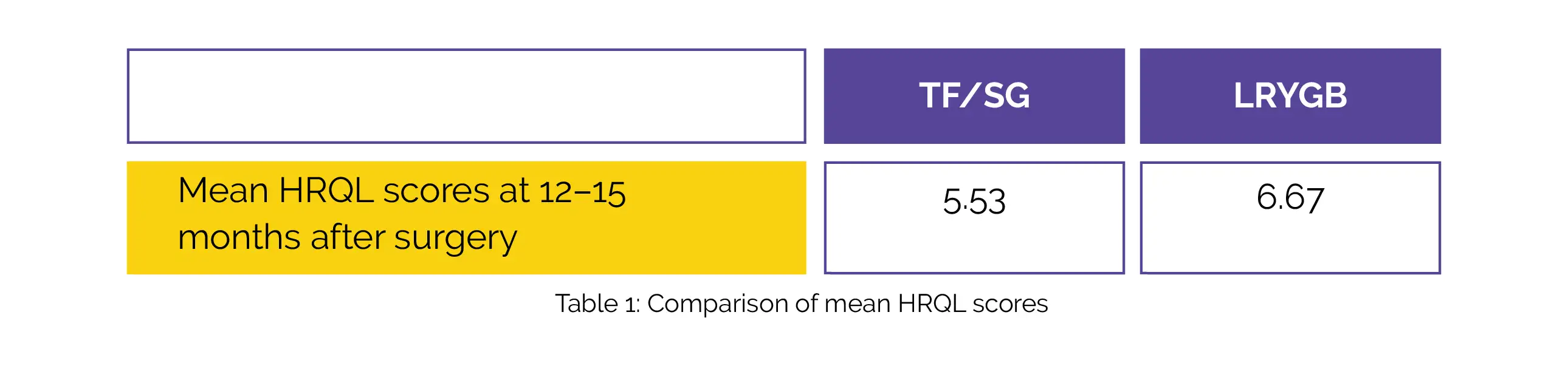 The following were the preoperative mean scores: Proton pump inhibitor (PPI) use was 93%, satisfaction rate was 6.5%, HRQL was 32.53, and RSI was 21.7. The mean BMI was 45.99 for TF/SG and 42.27 for LRYGB. Table 1 depicts the results for TF/SG and LRYGB at 12 to 15 months after surgery: