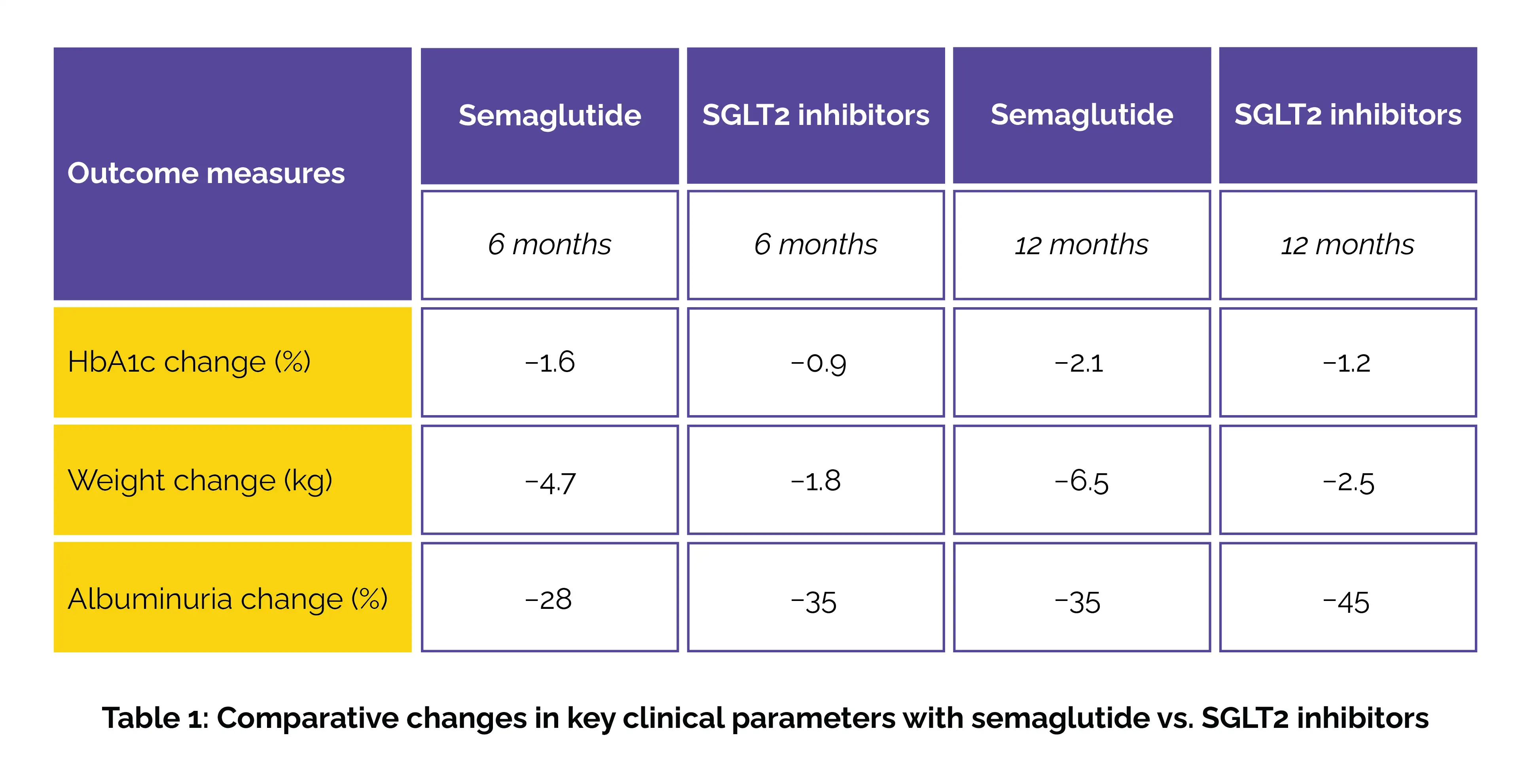 By the 6-month mark, both groups illustrated lower albuminuria and stable eGFR. Semaglutide users experienced larger drops in glycated hemoglobin (HbA1c) and body weight, while SGLT2 inhibitor patients experienced greater reductions in albuminuria. At 12 months, these trends persisted—SGLT2 inhibitors were found to substantially reduce albuminuria when compared to semaglutide, while semaglutide maintained its edge in glucose control and weight loss (Table 1).