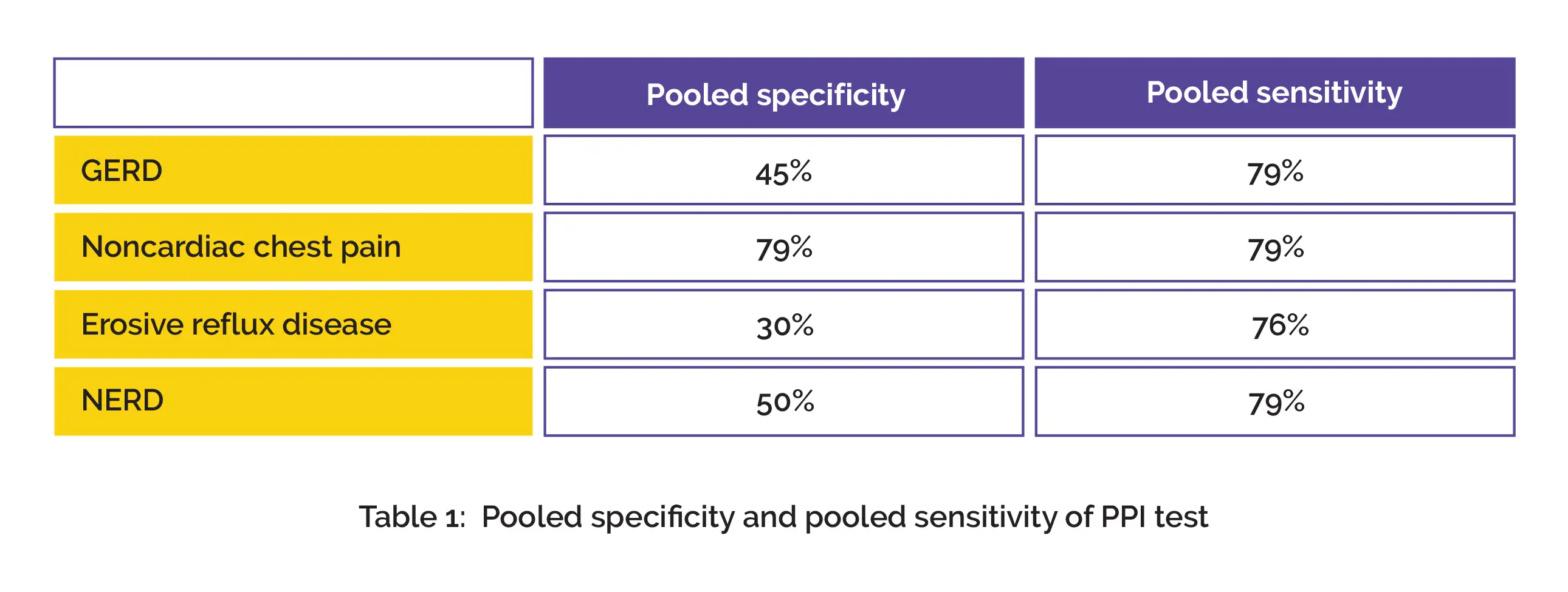 In a systematic review and meta-analysis, the proton pump inhibitor (PPI) test was found to be sensitive in gastroesophageal reflux disease (GERD) but with suboptimal specificity. In GERD-linked noncardiac chest pain, the test performed better. The diagnostic accuracy was comparable in non-erosive reflux disease (NERD) and erosive reflux disease.