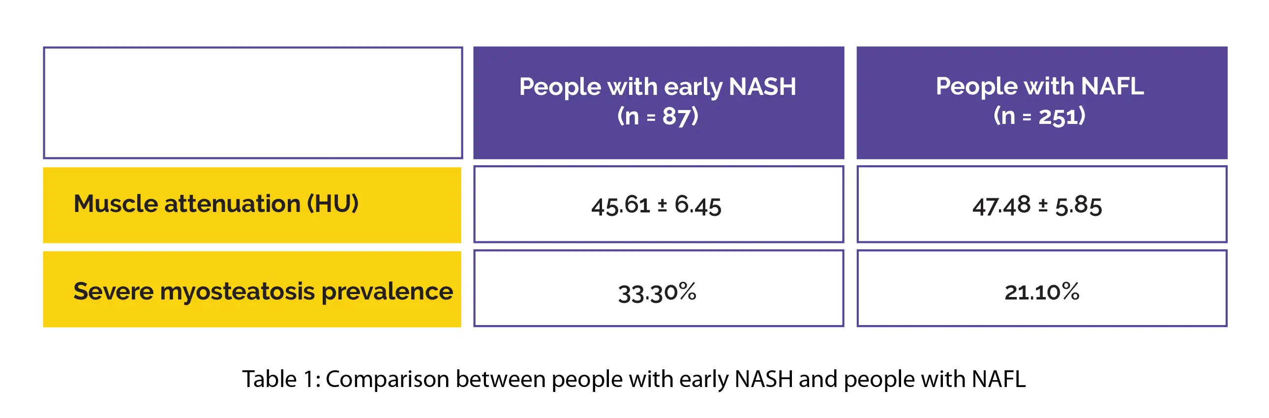 People with early NASH exhibited reduced muscle attenuation when compared to people with NAFL but a comparable skeletal muscle index. The prevalence of severe myosteatosis was greater in early NASH when compared to NAFL, as shown in Table 1: