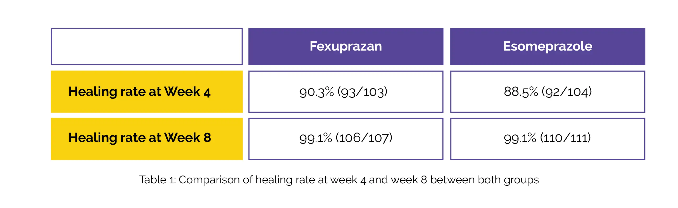 In terms of erosive esophagitis healing at week 8, 40 mg Fexuprazan is non-inferior to 40 mg Esomeprazole.