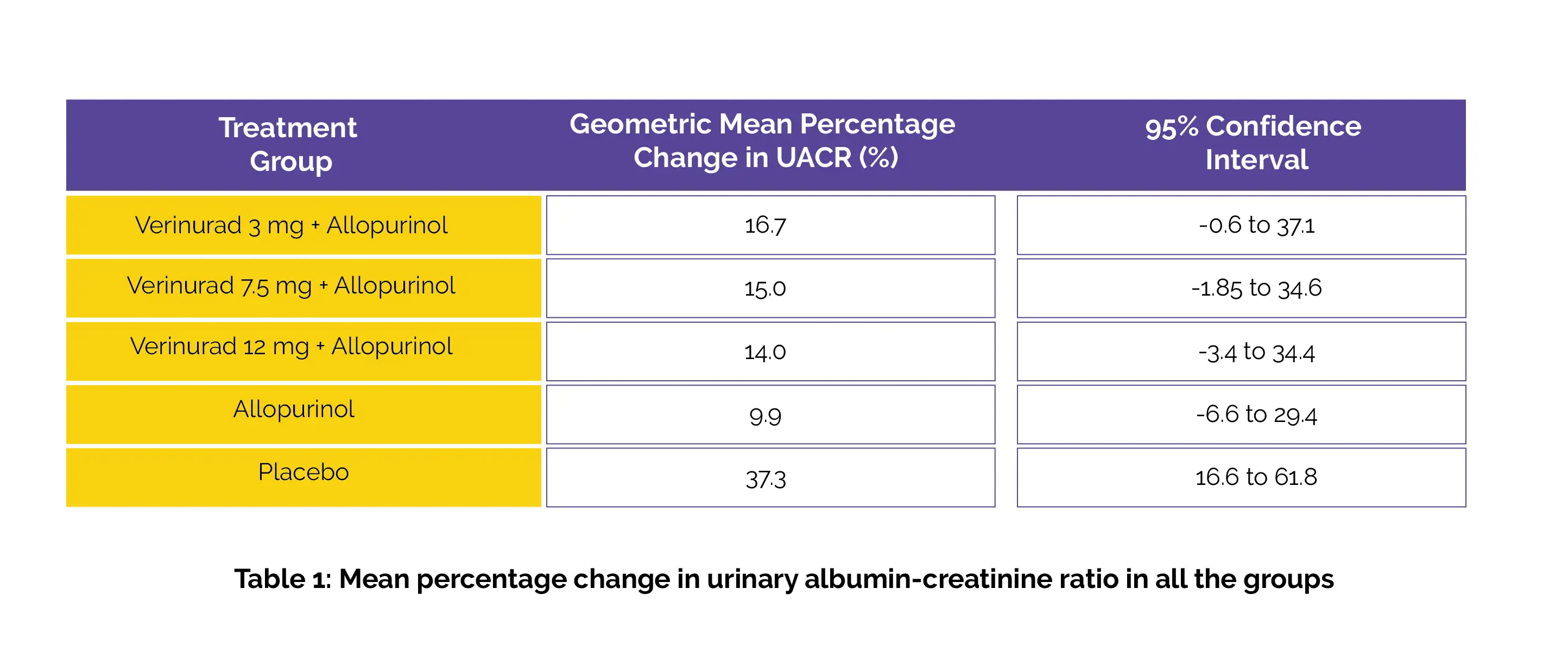 Adults with CKD were assigned to one of five groups: Placebo (Group 1); Placebo + Allopurinol 300 mg given daily (Group 2); Verinurad 3 mg + Allopurinol 300 mg given daily (Group 3); Verinurad 7.5 mg + Allopurinol 300 mg given daily (Group 4), or Verinurad 12 mg with Allopurinol 300 mg given daily (Group 5). The change in UACR from the starting point to 34 weeks (primary outcome) and serum urate and eGFR at both weeks 34 and 60 (secondary outcome) were assessed.