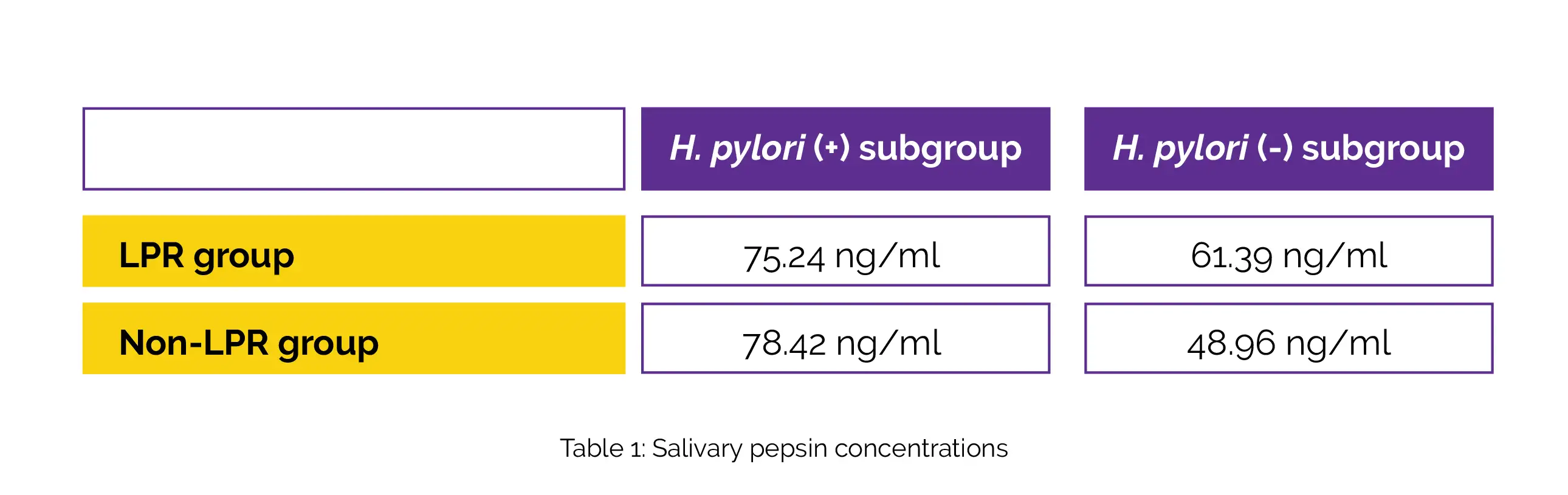The scores of vocal fold edema (1.04 vs. 0.85), persistent cough (0.88 vs. 0.50), erythema or hyperemia (1.93 vs. 1.78), were greater in the LPR (+) H. pylori (+) subgroup when compared to the LPR (+) H. pylori (-) subgroup. In patients with LPR and non-LPR, the salivary pepsin concentrations in the H. pylori (+) subgroup were raised when compared to the H. pylori (-) subgroup, as shown in Table 1: