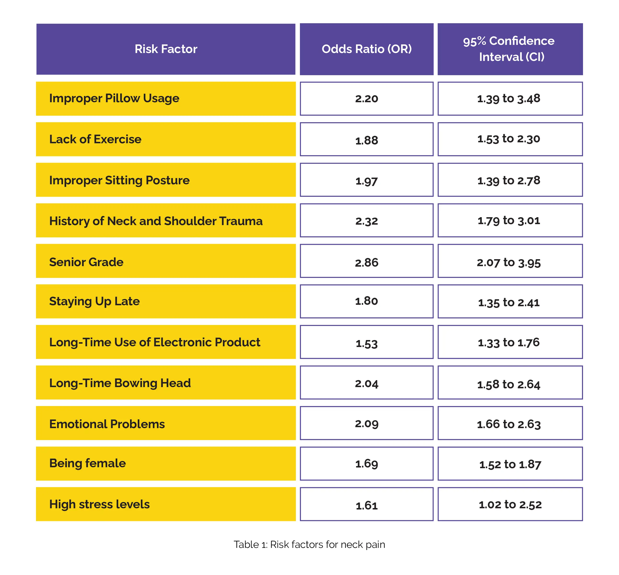 Predominant among these factors, strongly supported by robust evidence, were improper pillow usage, inadequate physical exercise, improper sitting posture, history of neck and shoulder trauma, senior academic standing, staying up late, prolonged daily use of electronic devices, extended periods of bowing the head, and experiencing emotional distress. Moderately supported risk factors encompassed being female and high stress levels (Table 1).