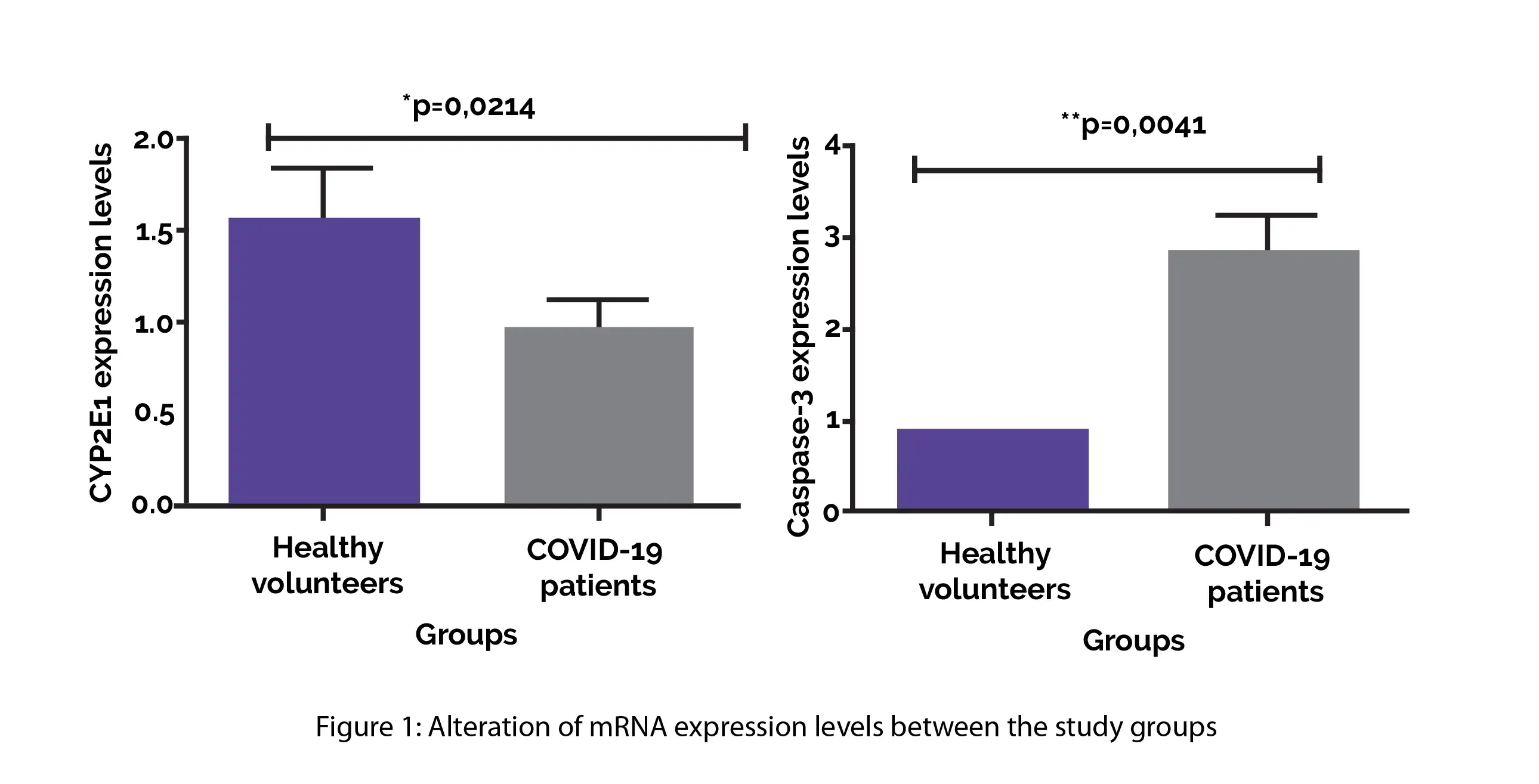 The Caspase-3 expression indicated apoptotic situations of patients. However, it was not linked with the expression level of CYP2E1. For metabolizing xenobiotics and endogens, CYP2E1 gene expression is a pivotal factor. But, SARS-CoV-2 people showed reduced expression of CYP2E1.