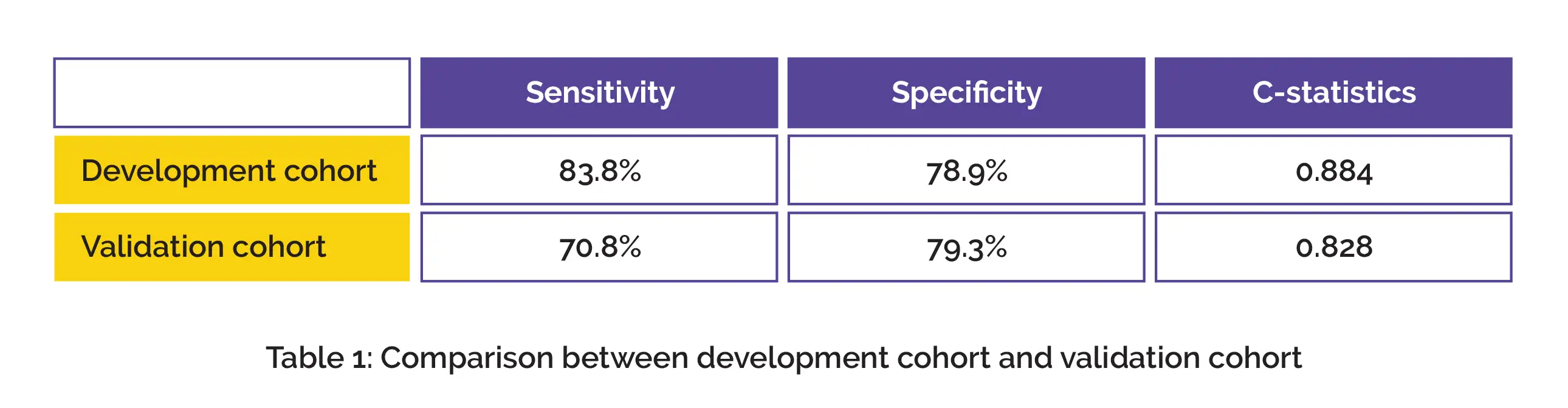 For each patient, the risk scores were estimated. In total, 2 cohorts were specified: (i) high risk (9 to 20 points), and (ii) low risk (0 to 8 points). The C-statistics, specificity, and sensitivity of the KDDH scoring system in the development and validation cohorts are shown in Table 1: