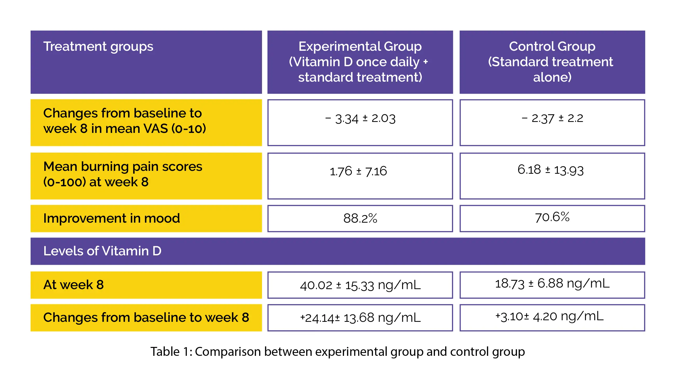 The enrolled volunteers (n=68) were segregated into two groups: (i) Experimental group (n=34): Given oral 5000 IU vitamin D once daily and standard treatment (amitriptyline, gabapentin, or pregabalin) for 8 weeks, (ii) Control group (n=34): Given standard treatment alone. Alteration in visual analog scale (VAS) score, numerical rating scale (NRS) score, and brief pain inventory were the outcomes ascertained. The levels of vitamin D were estimated prior to and after the trial.