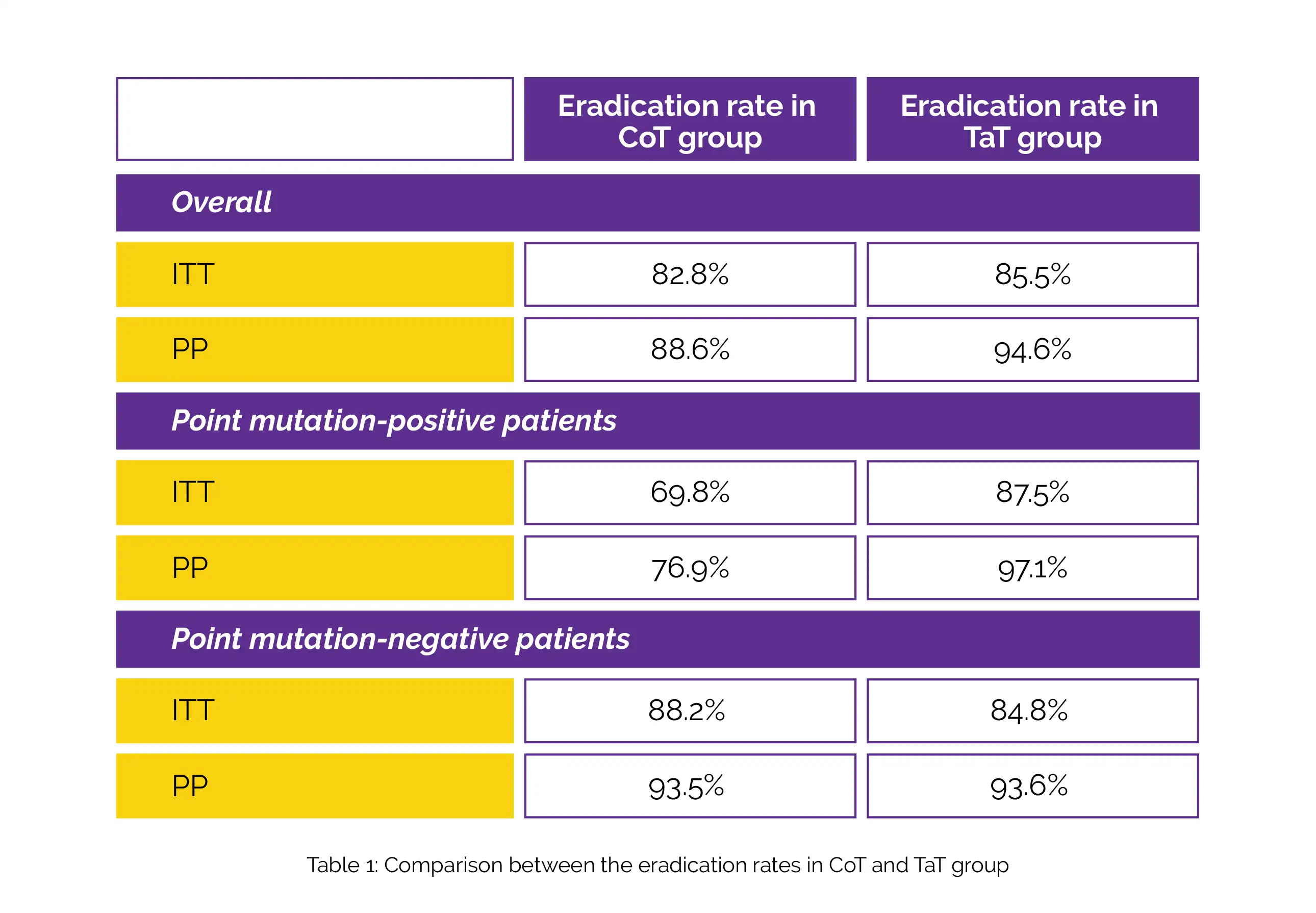 Intention-to-treat (ITT) and per-protocol (PP) studies each included 290 and 261 patients, respectively. In 28.6% of the patients, A2142G and/or A2143G point mutations were found. According to analyses conducted using ITT and PP, there was no discernible difference in the overall eradication rates between the 2 groups. According to ITT and PP assessments, the rate of elimination in the CoT group was lower than those in the TaT group in subjects who tested positive for point mutations. On the other hand, there was no considerable difference in the elimination rates who tested negative for point mutations, as shown in Table 1: