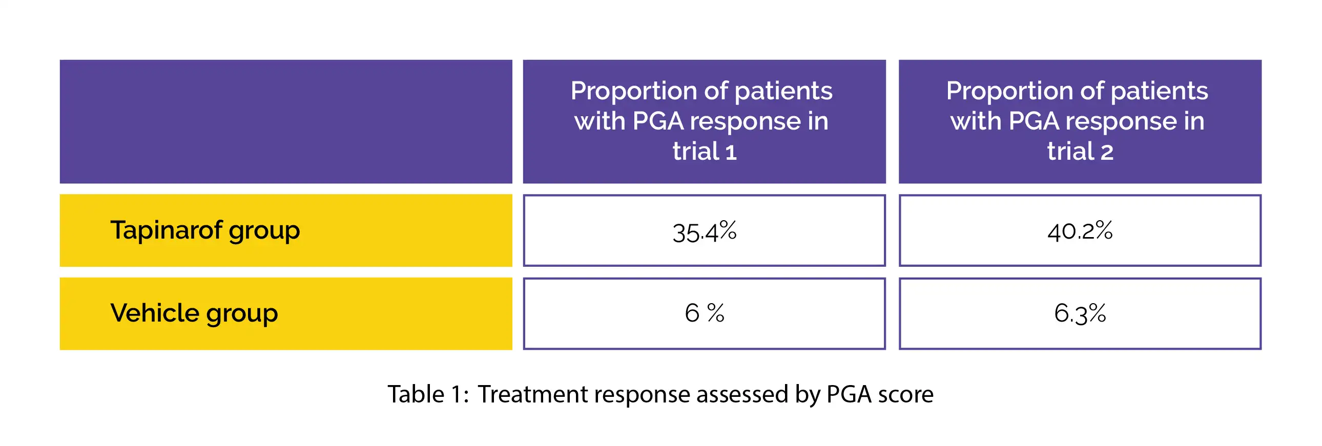 A total of 692 patients were screened in trial 1, among which 510 were enrolled. Similarly, 674 were screened in trial 2, among which 515 patients were included. Treatment response evaluated by PGA score was observed as below: