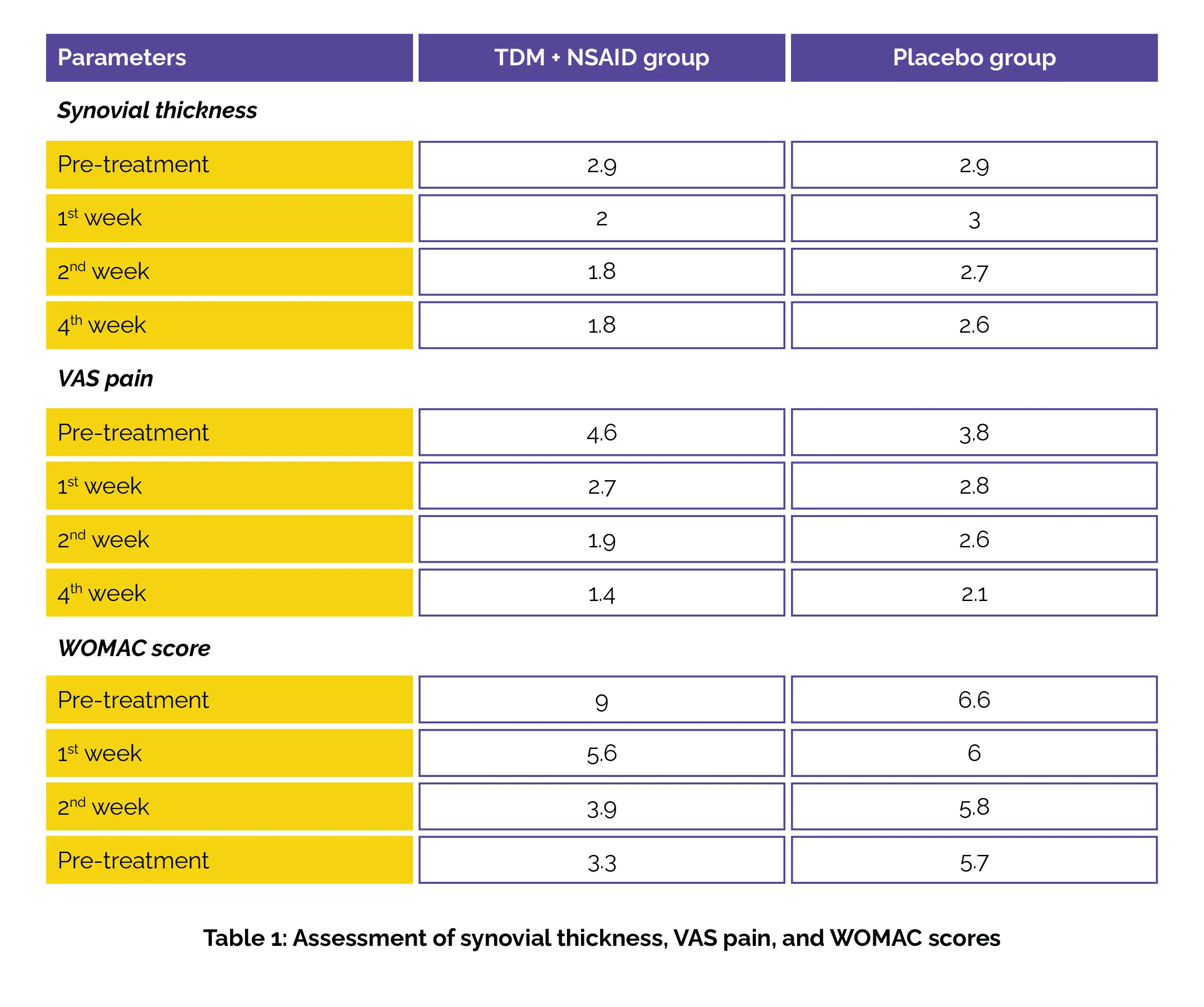 By week 4, the mean reduction in synovial thickness measured 1.1 mm for the TDM + NSAID group and 0.3 mm for the placebo group, while the mean reduction in VAS scores was 3.2 and 1.7, respectively. Additionally, the mean WOMAC scores at week 4 illustrated significant decreases, with scores of 5.7 and 0.9 recorded for the TDM + NSAID and placebo groups, respectively.