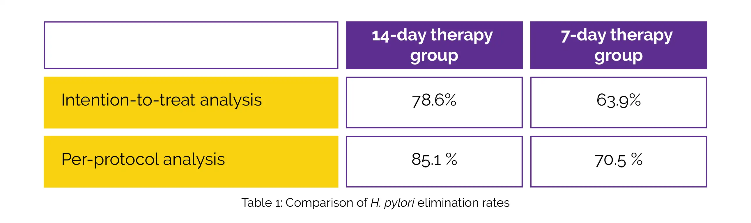 Notably, 435/948 and 513/948 participants were administered Tegoprazan-based triple treatment (7-day and 14-day regimens, respectively). In the 14-day therapy group, the rate of elimination was greater than in the 7-day therapy group, as shown in Table 1: