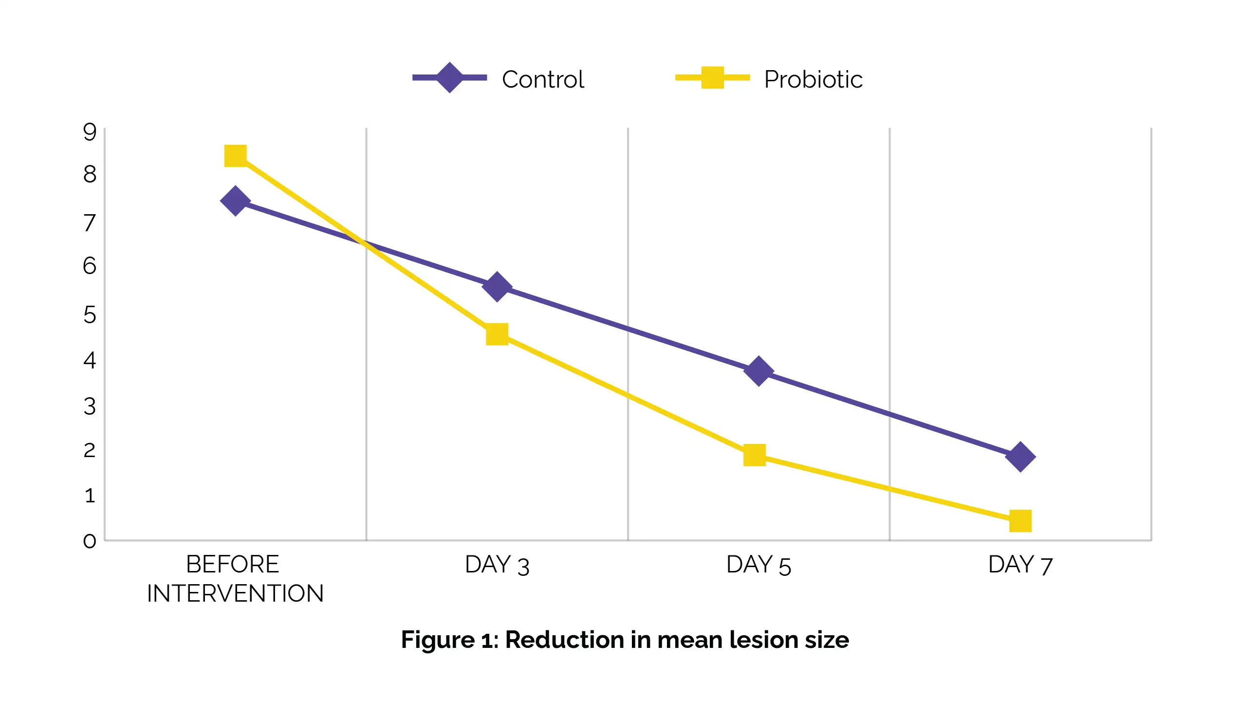 Prior to the intervention, both groups illustrated no vital differences in lesion size and intensity of pain. Remarkably, participants in both groups experienced profound reductions in pain intensity and lesion size over the course of the study. However, after just one week, the probiotic group demonstrated notably larger reductions in lesion size compared to the control group, with a profound difference (P-value = 0.01), as shown in Figure 1: