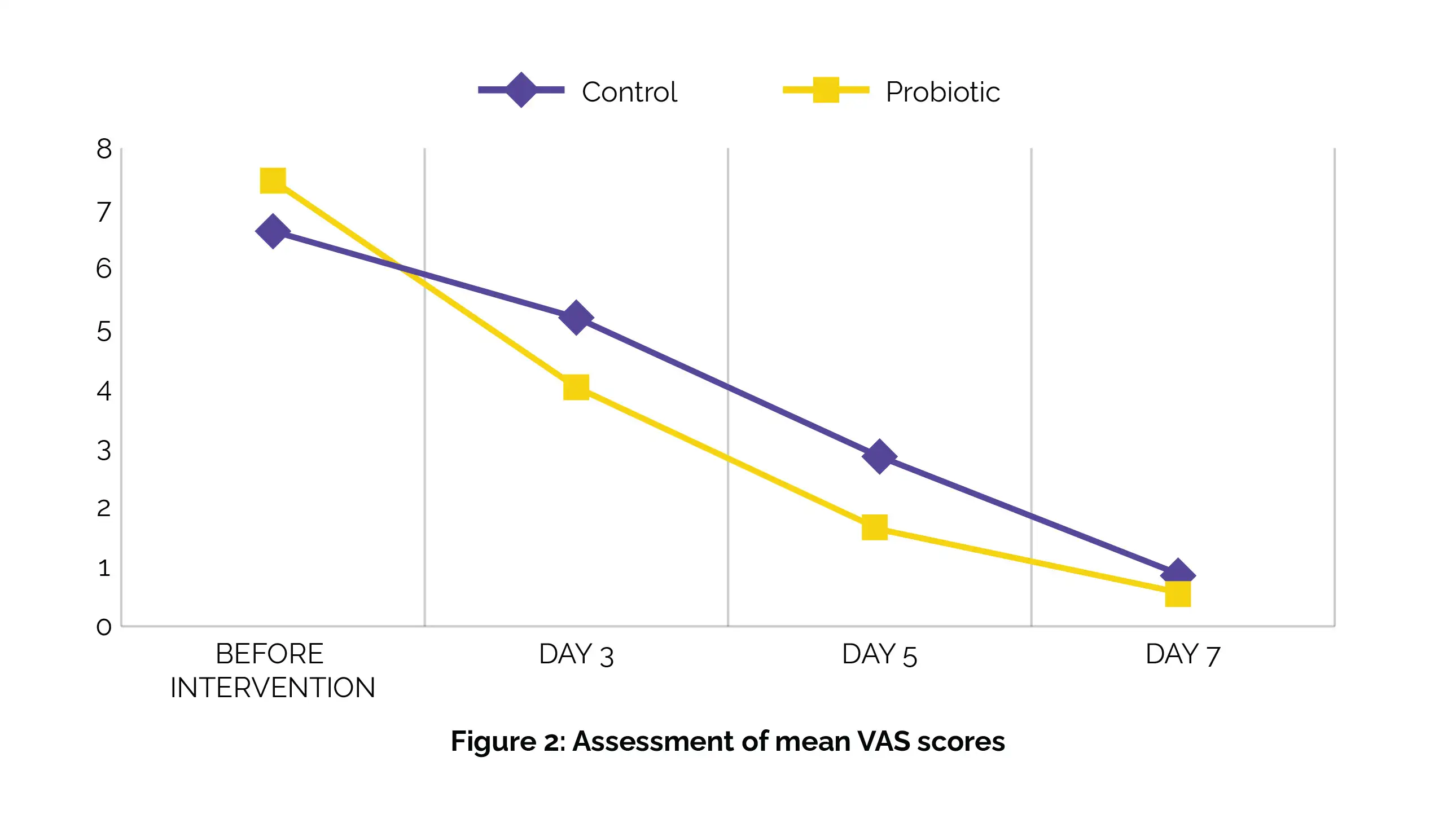 Additionally, the probiotic group illustrated a significantly greater decrease in pain severity when compared to the control group (P-value = 0.04), as shown in Figure 2: