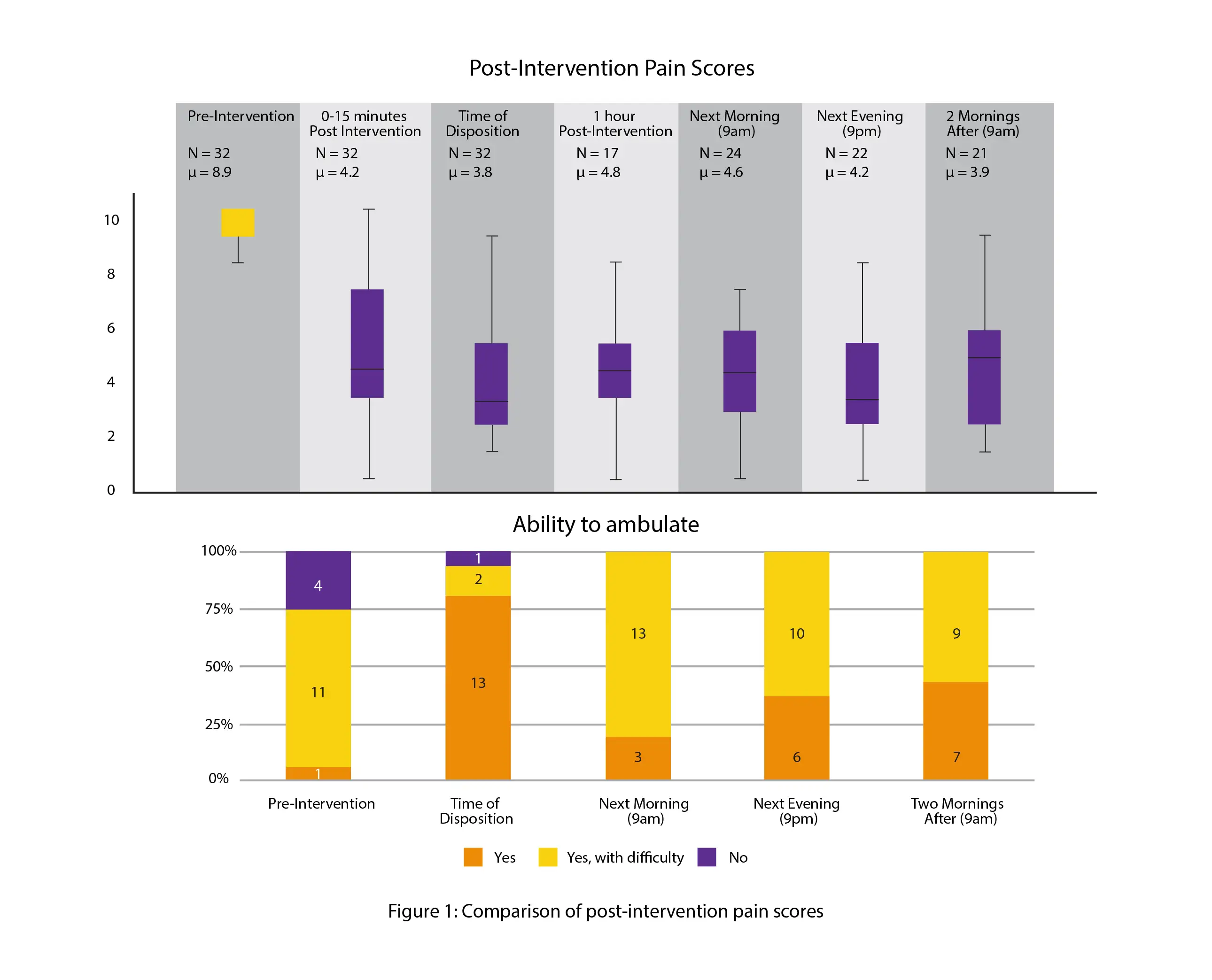 Notably, 15–30 minutes after the block, patients' numerical pain ratings (0–10) on average dropped by 4.72 points. For 71.9% (23/32) of the subjects, there was a post-block enhancement in TUG performance. However, for 25% (8/32) of the patients, there was no alteration in TUG performance, and for 3.1% (1/32) of the patients, there was a worsening of TUG performance. Before the TGSNB, physicians predicted that 50% (16/32) of subjects would need a hospital admission or observation unit. However, after the block, only 19% (6/32) of patients needed either. The findings of the pain and ambulation assessment conducted 72 hours after the block are shown in Figure 1.