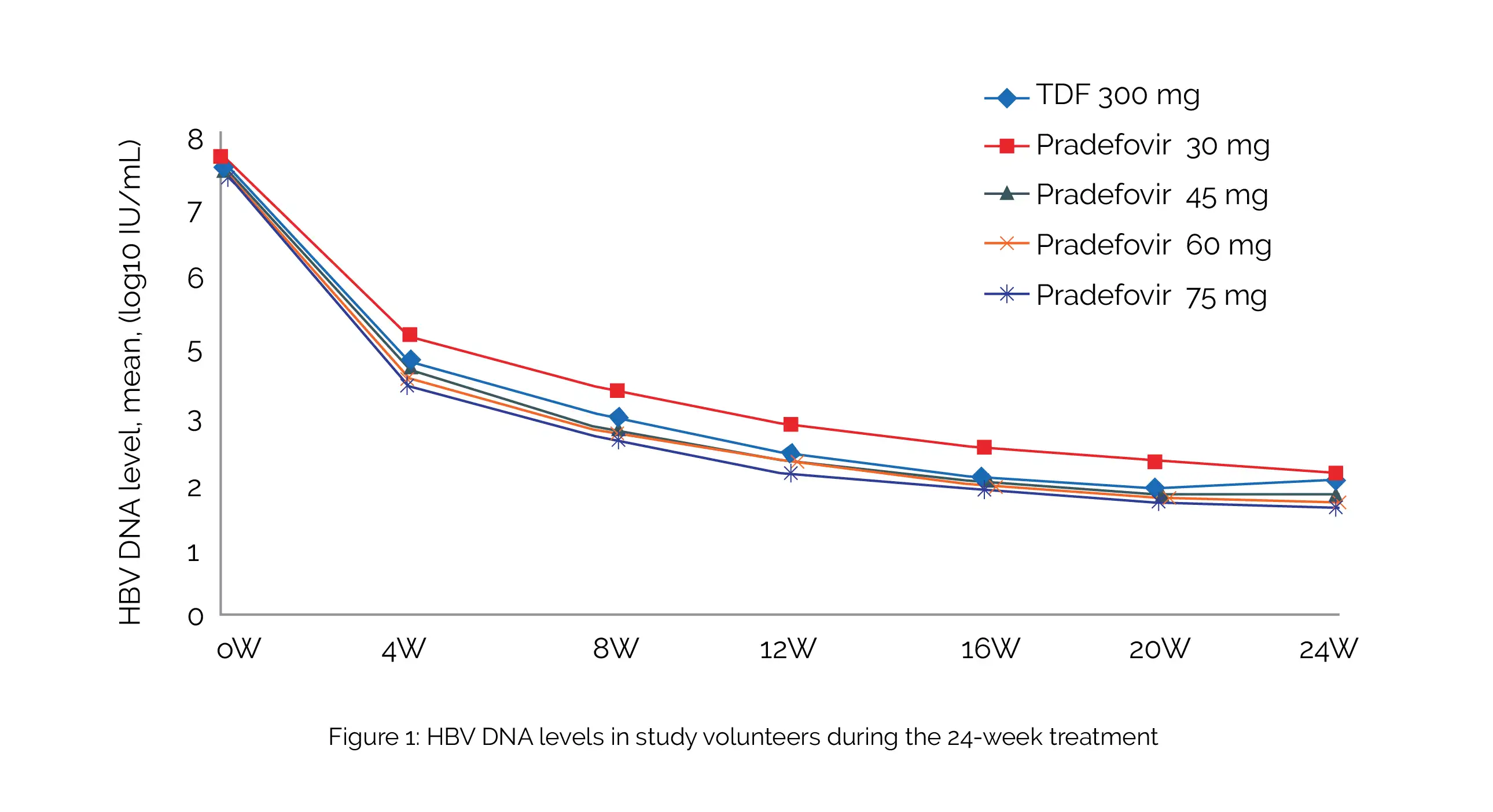The study included therapy-naive and experienced (not on therapy for more than six months) people suffering from hepatitis. Overall, 240 people (48 per group) were randomized and studied. Approximately 80% of them tested positive for the hepatitis B e antigen (HBeAg), and 10% developed liver cirrhosis. In comparison with 5.12 log10 IU/mL with TDF, the decrease in HBV DNA levels from baseline at week 24 were 5.40, 5.34, 5.33, and 5.40 log10 IU/mL with dosages of 30, 45, 60, and 75 mg of Pradefovir, respectively, as shown in Figure 1: