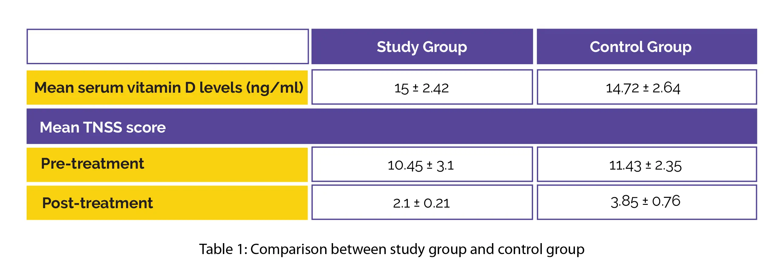 Allergic rhinitis people illustrated deficiency in vitamin D as illustrated by mean serum vitamin D levels. The pre-treatment and post-treatment mean TNSS score in the study group and the control group, is shown in Table 1: