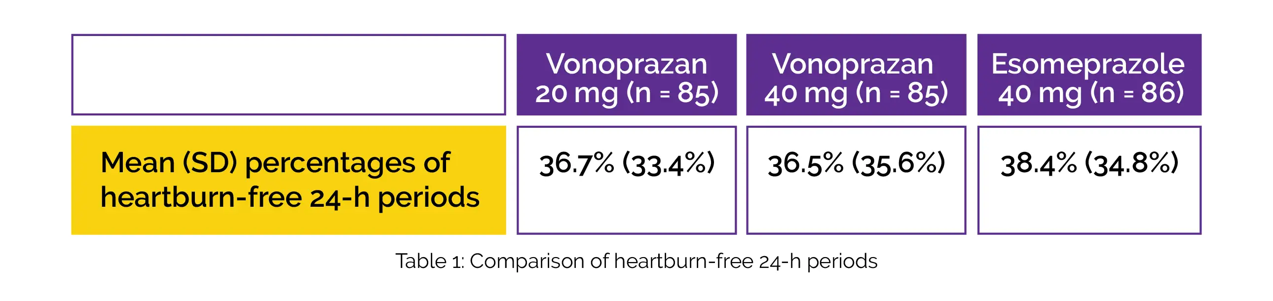 Overall, 256 patients (mean age 52.6 years; females, 59.4%) who had GERD symptoms and a partial response to a healing dosage of Esomeprazole were randomly assigned to receive Vonoprazan 20 mg once a day (q.d.) (n = 85) and 40 mg (n = 85) vs. Esomeprazole 40 mg q.d (n = 86). Regarding the mean (standard deviation [SD]) percentage of heartburn-free 24-hour periods, there was no intergroup statistical significance, as depicted in Table 1: