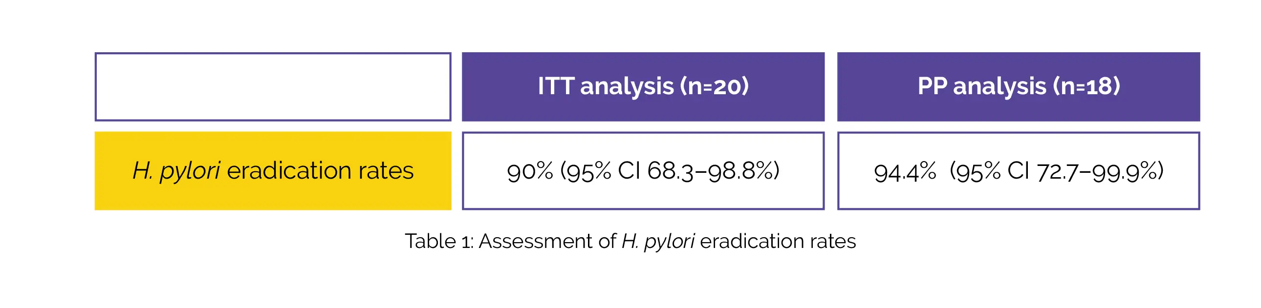 Twenty H. pylori-positive individuals with no prior history of eradication received a 7-day course of treatment that included 20 mg Vonoprazan twice daily and 500 mg Amoxicillin four times daily. A test for H. pylori antigen in the stool was used to determine eradication. Using patient questionnaires, safety was assessed. The intention-to-treat (ITT) and per-protocol (PP) eradication rates are shown in Table 1: