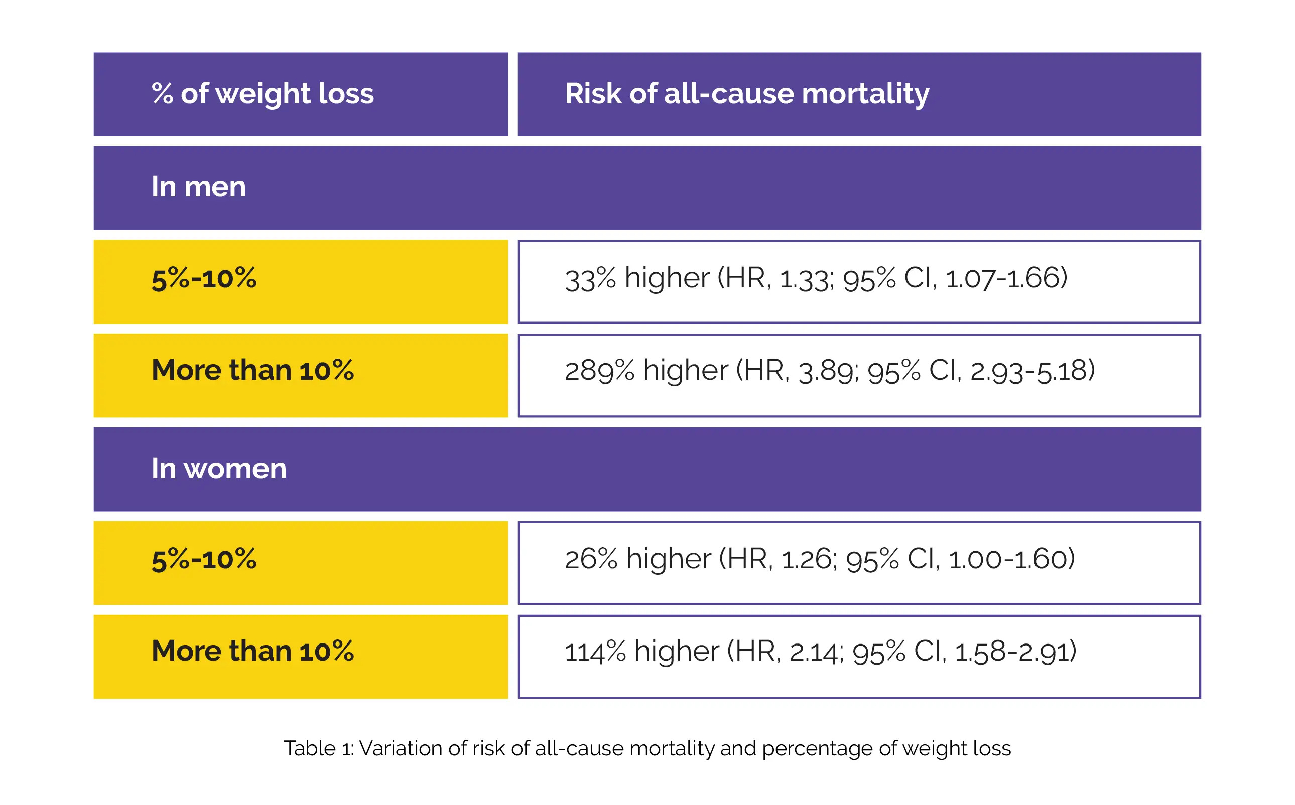 Body weight loss has been implicated with higher all-cause and increased possibility of cancer, cardiovascular diseases (CVD), and other fatal conditions (disease-specific mortality), elucidates a research comprising healthy older adults. Sultana Monira Hussain et al. performed a post hoc analysis of data from the Aspirin in Reducing Events in the Elderly (ASPREE) clinical trial to study the possible link between changes in body weight and waist circumference with mortality (all-cause, cancer-specific, CVD-specific, and non-cancer non-CVD–specific mortality).