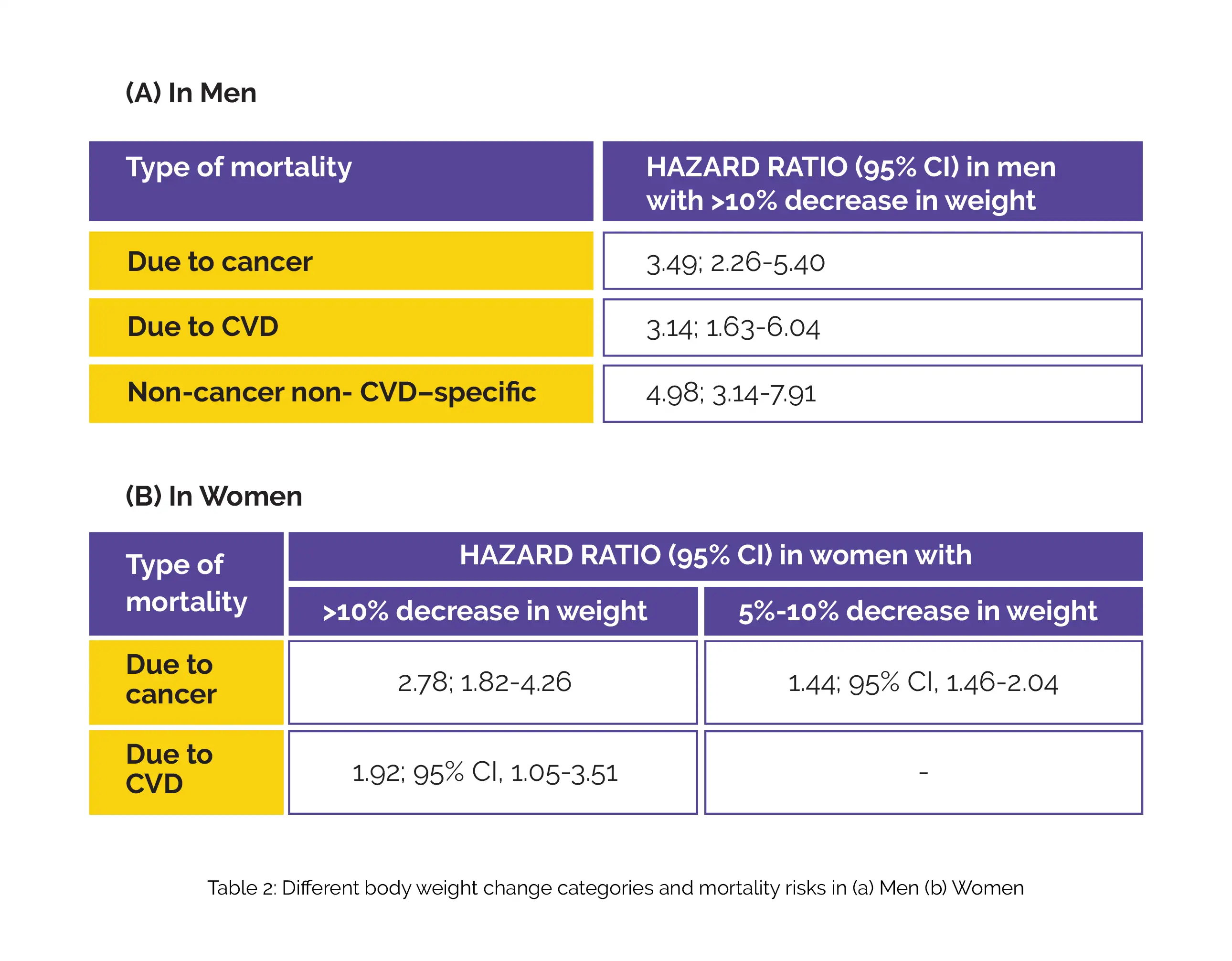 Weight loss was associated with higher cancer-specific mortality, CVD-specific mortality and non-cancer non-CVD-specific mortality (details in Table 2).
